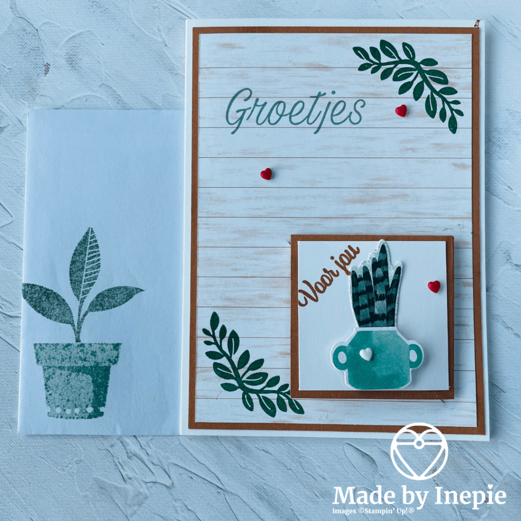Ik heb gekozen voor een voor mij nieuwe set: Plantenpost. Met Nederlandse teksten, daar word ik altijd blij van. Ook het mooie Bloom Where You’re Planted dsp is prachtig en met de bijbehorende stansen kun je uit dit Dsp heel veel planten en potten uitstansen. Dit vind ik echt zo fijn van Stampin Up! De tekst Groetjes komt uit de set Pluk de Dag! En ik heb nog wat hartjes toegevoegd als extra accent.