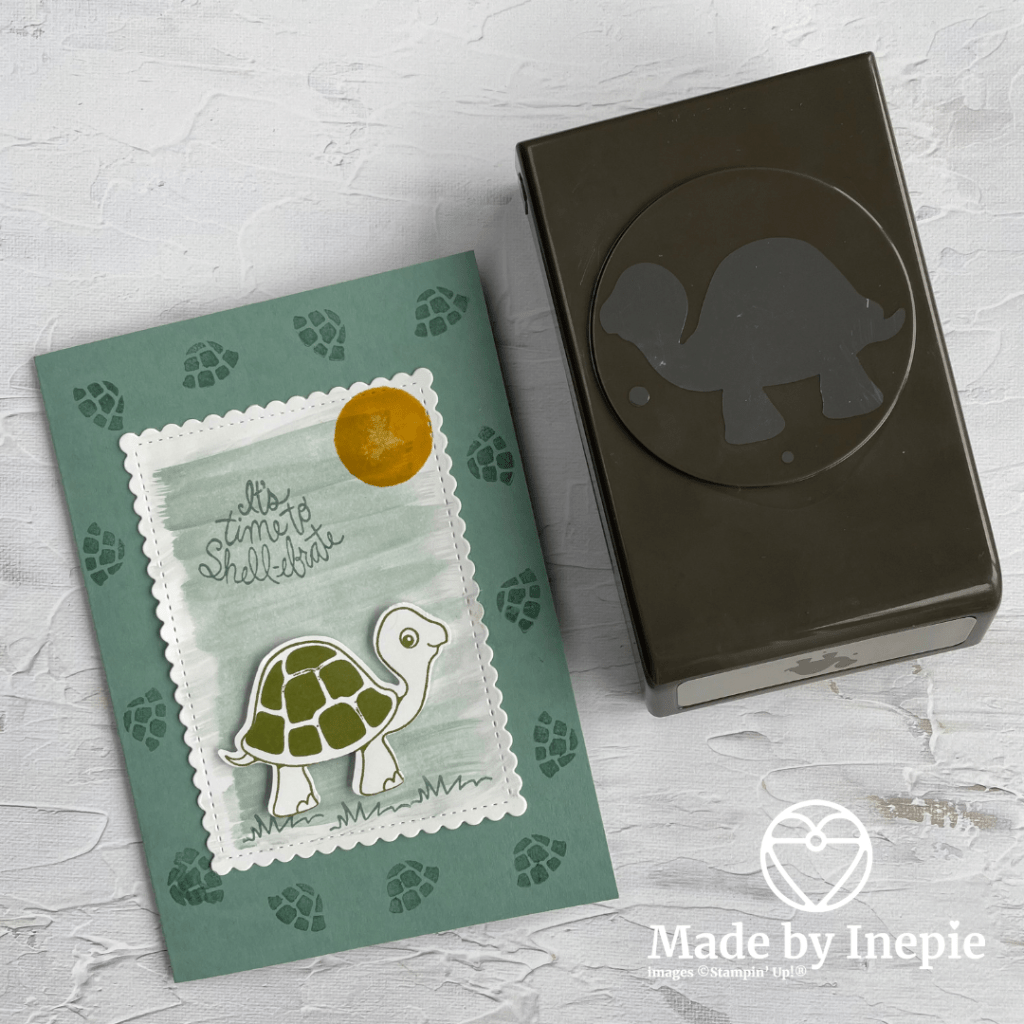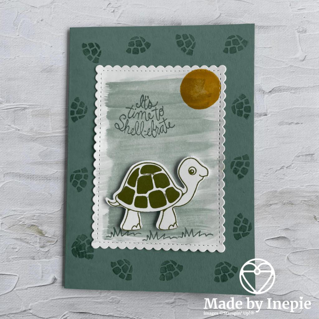 Ik heb ook een andere tekst uit de set gebruikt en “It’s time to Shell-ebrate extra benadrukt door met het kleine schildje ( Shell) de basiskaart te versieren. De achtergrond heb ik precies hetzelfde gemaakt met de water painter en de zon met de Watercolor Shapes. En toch ziet het kaartje er heel anders uit: