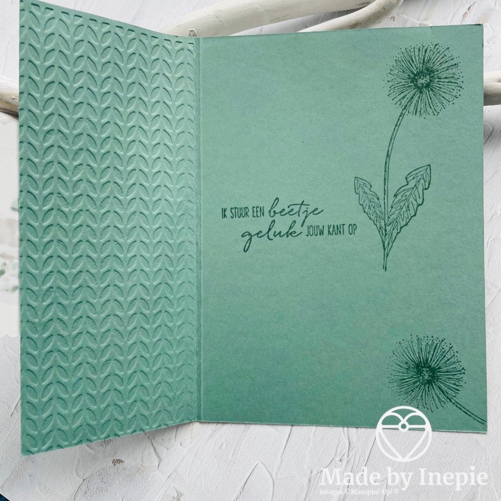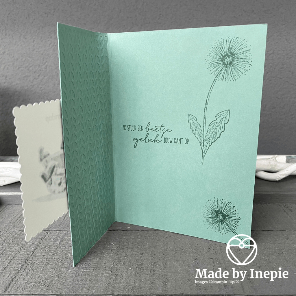 Met een andere Nederlandse set, Wensbloemen heb ik twee bloemen gestempeld en de tekst: “Ik stuur een beetje geluk jouw kant op.”