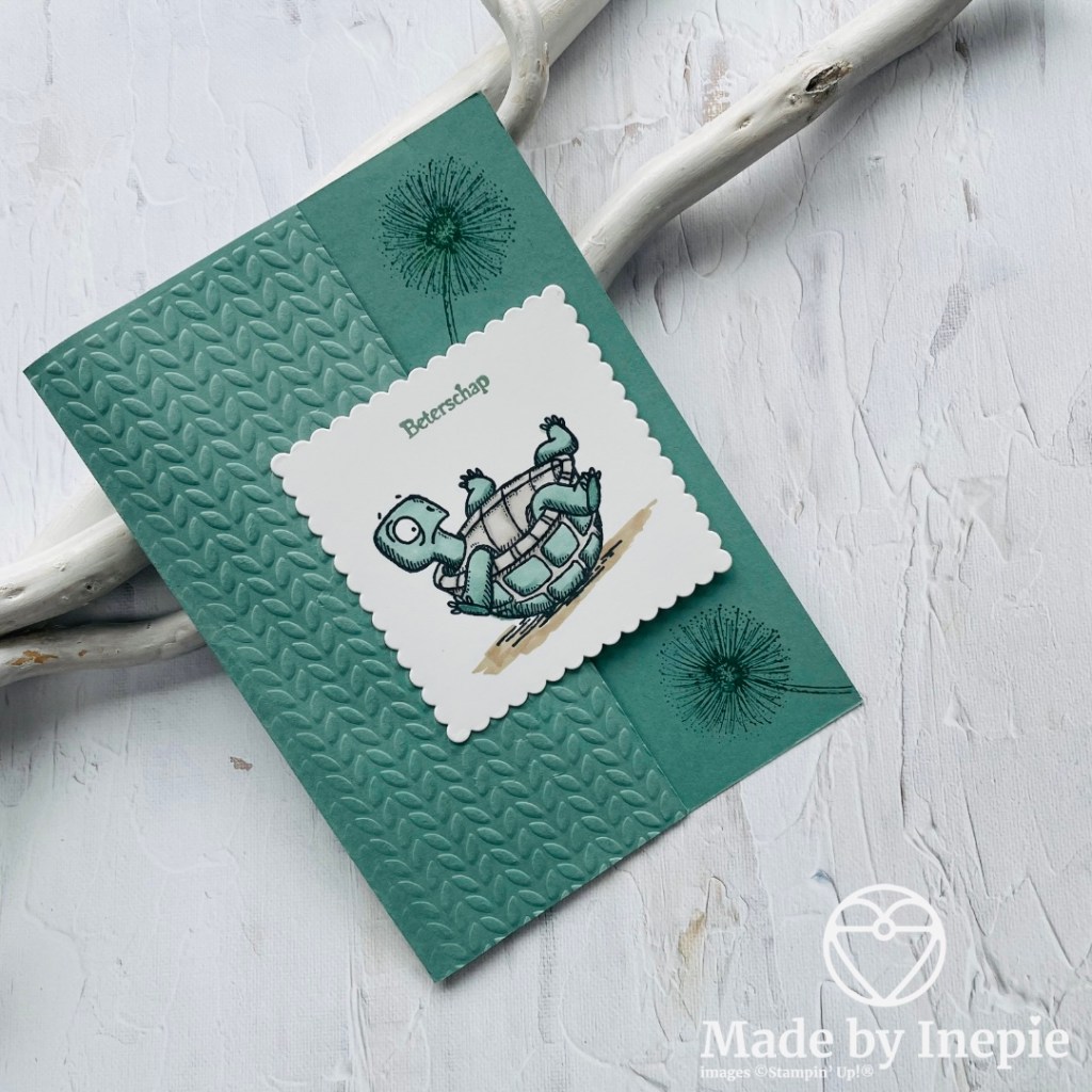 De afbeelding heb ik uitgestanst met de Square Dies en toen heb ik de basiskaart voor een deel ge-embossed met de Greenery Embossing folder. Ik heb van de voorkant van de kaart een stukje afgesneden om de schildpad beter op te laten vallen. En deze dus halverwege de kaart opgeplakt