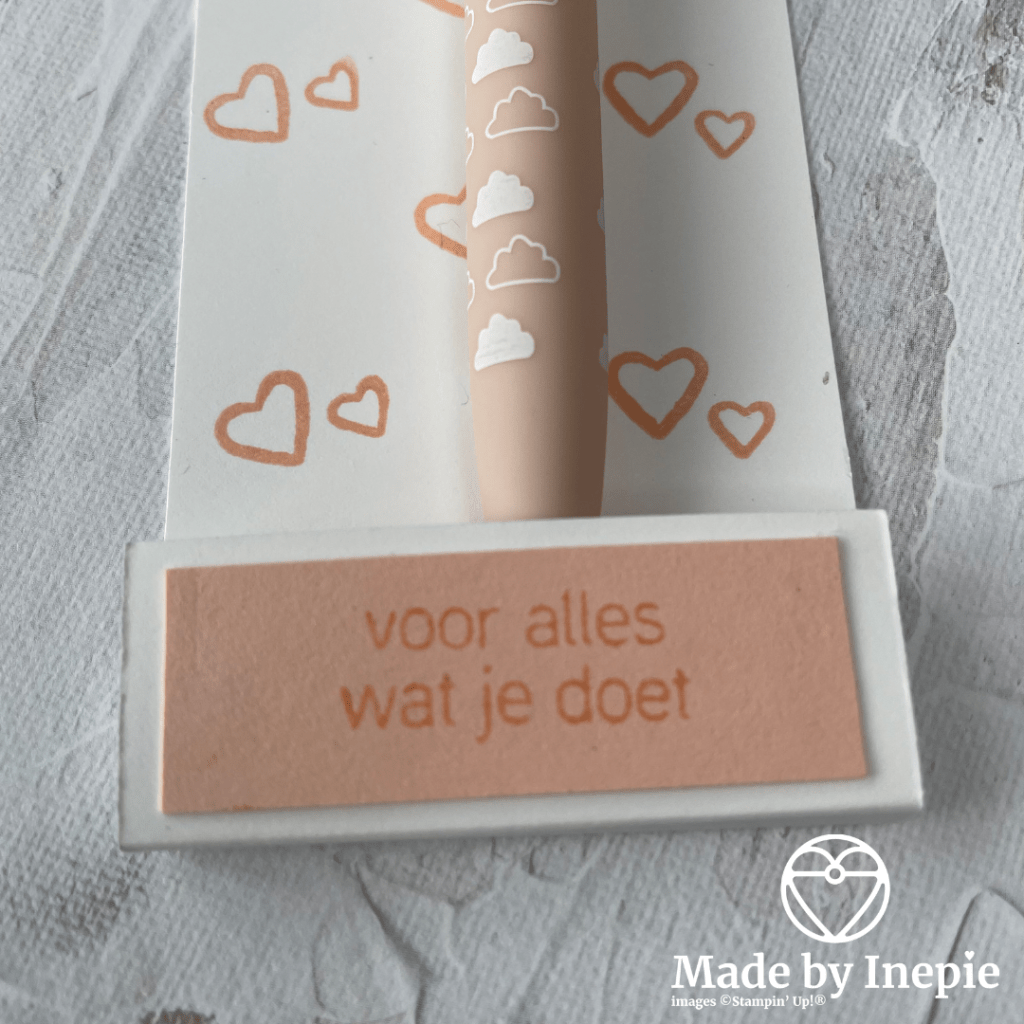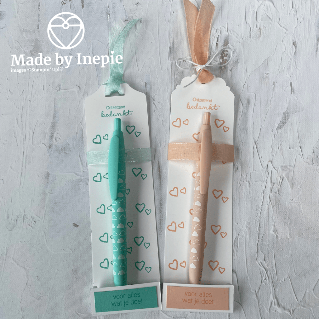 De pennen hadden echt Stampin’Up! kleuren: Petal Pink en Coastal Cabana. Dus daar heb ik mee gestempeld, de hartjes komen uit de Pampered Pets stempelset en de teksten uit Hemelse Hortensia. De strookjes cardstock zijn 4,5 cm bij 1,5 cm.