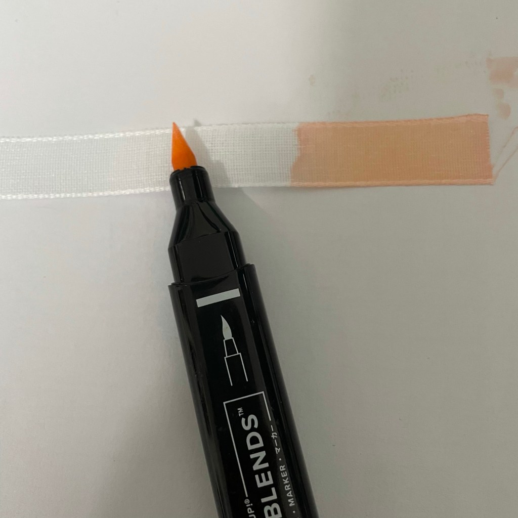 Om de pennen te bevestigen heb ik lint gebruikt wat ik aan de achterkant heb vast gezet met Tear and Tape. Het Sheer Ribbon Pool Party paste perfect bij het Coastal Cabana maar ik had geen Petal Pink lint dus mijn witte lint gekleurd met mijn Dark Petal Pink Stampin Blend.
