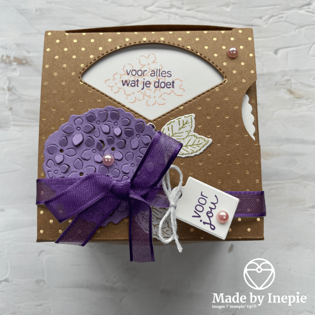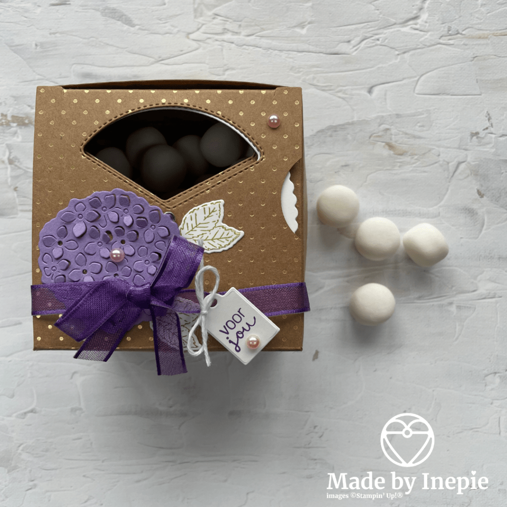 En ja het werkt: pepermunt bolletjes erin.Draaien en schudden maar en ze komen eruit gerold. Zo gaaf. Ik word helemaal blij dat iets wat in je hoofd zit ook uit je handen komt. De doos heb ik versierd met de bijbehorende Hydrangea Dies, wat Pastel Pearls en een strik van Gorgeous Grape Sheer Ribbon. Is het geen plaatje?