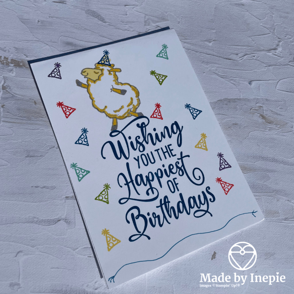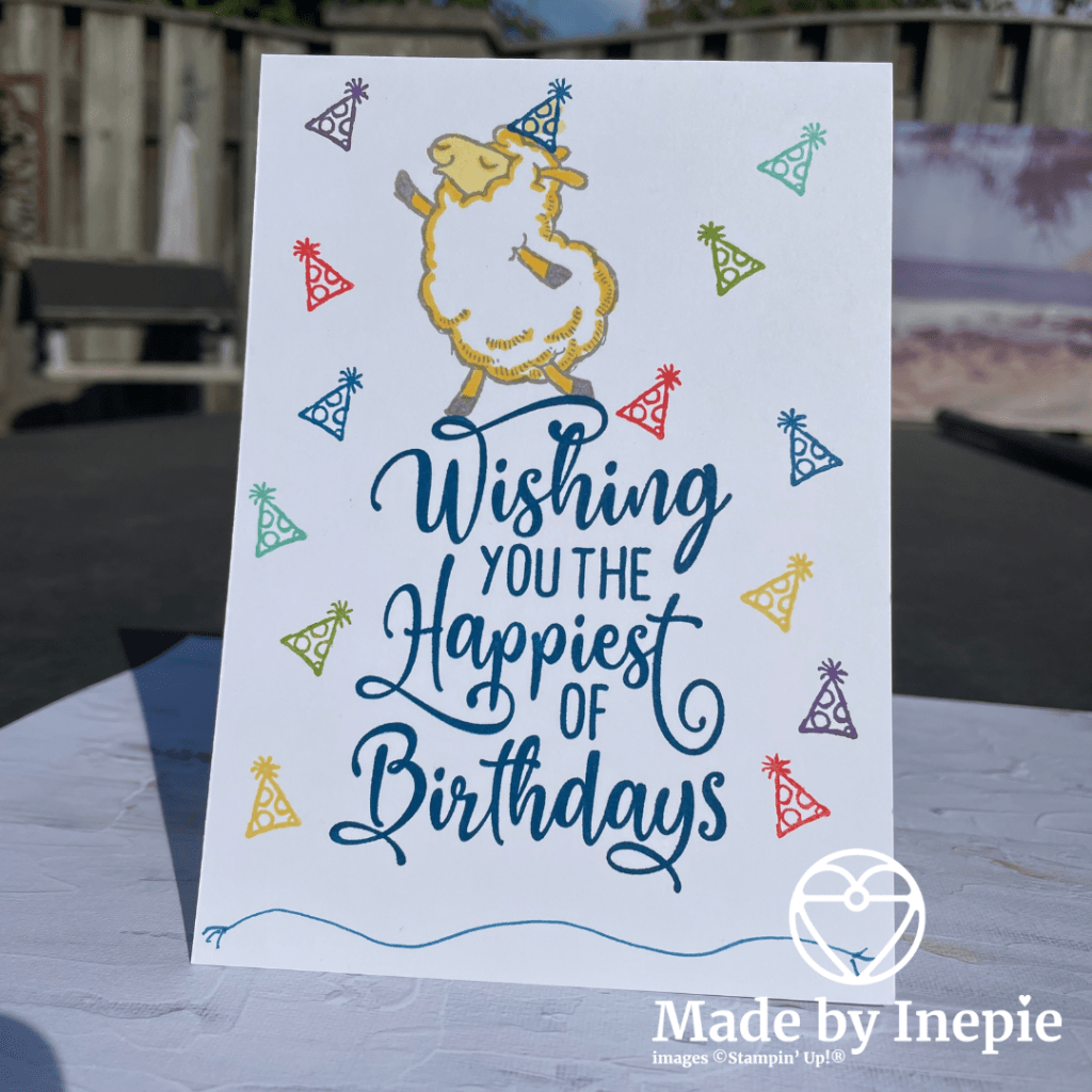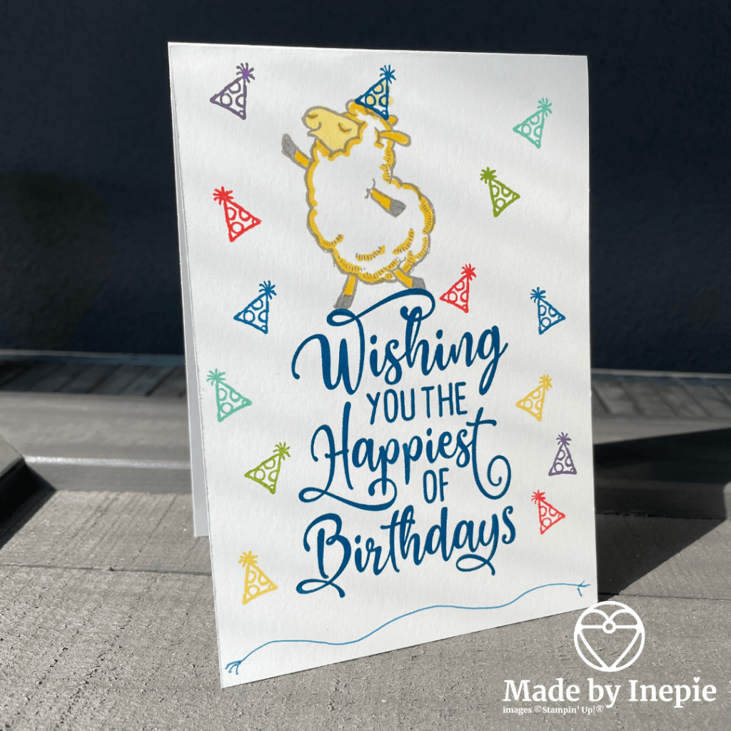 Ik heb ervoor gekozen om gewoon lekker te stempelen. Het schaapje heb ik met mijn Dark Daffodil Delight Stampin Blend wat kleur gegeven. Onderin vond ik het wat kaal dus met mijn Pacific Point Stampin Write Marker een speels lijntje getrokken.