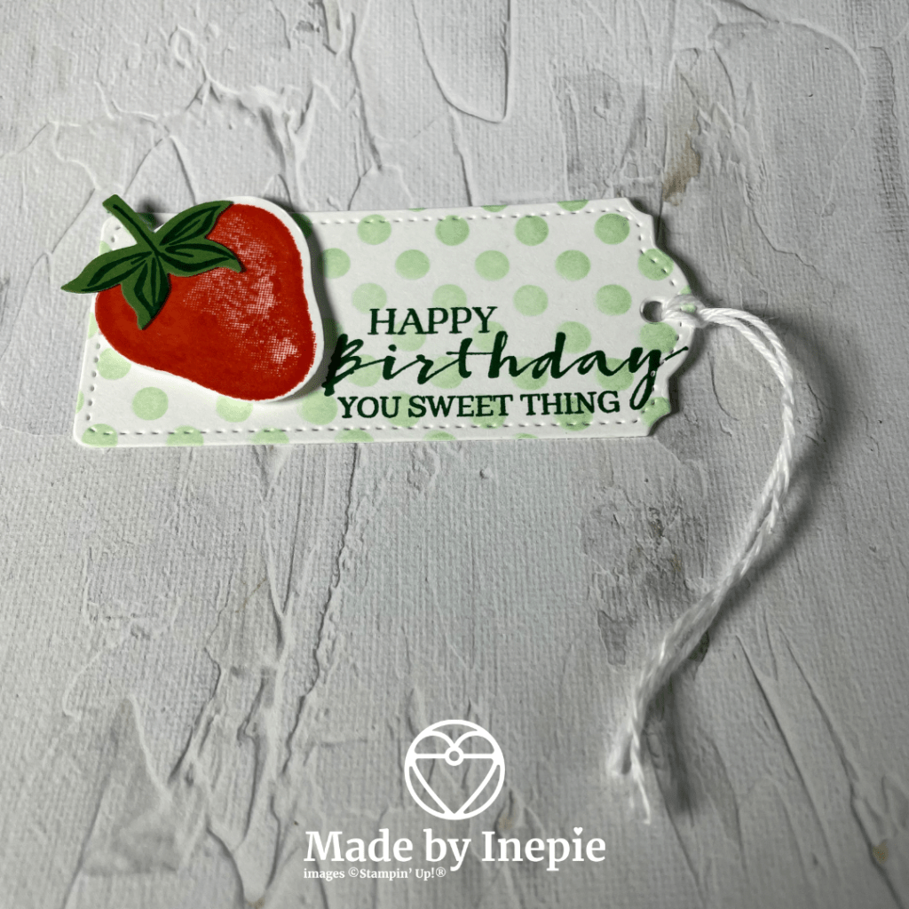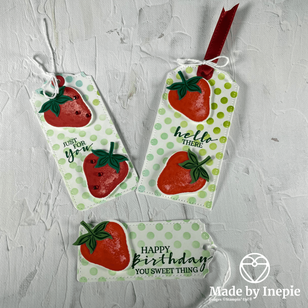 Ik was nog steeds bezig met de achtergrondjes en de aardbeien en met de Tailor Made Tags heb ik deze 3 leuke labels gemaakt.