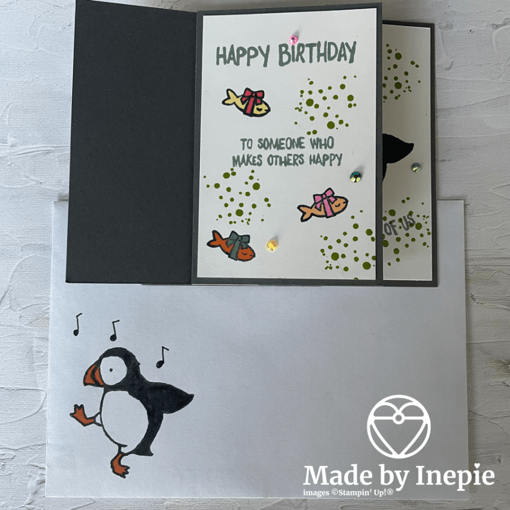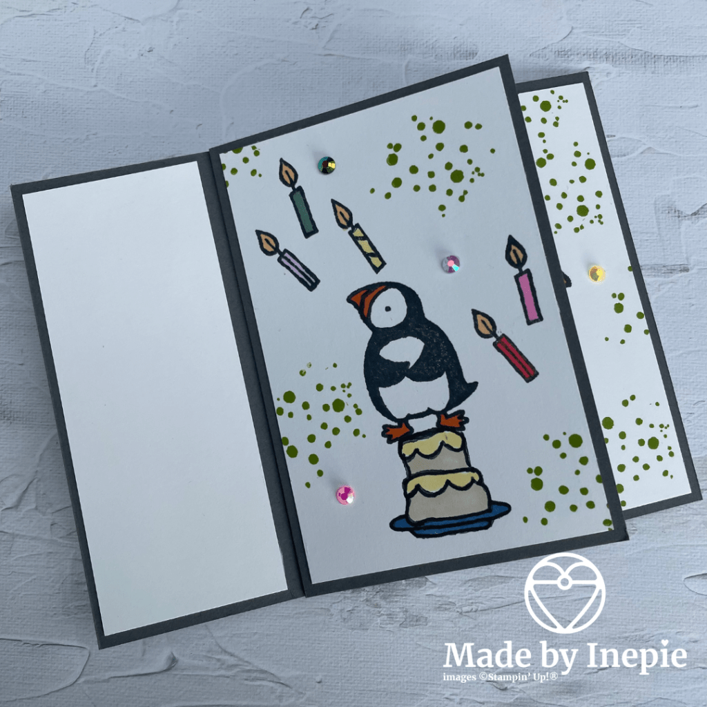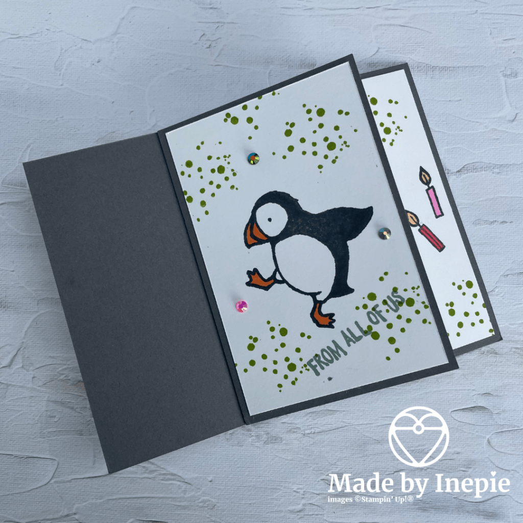 Ik heb de Party Puffins gebruikt en lekker gekleurd en gestempeld. Voor de Blingbling heb ik de 2021-2023 In Color Jewels gebruikt. En voor de stipjes de Sweet Ice Cream stempelset.