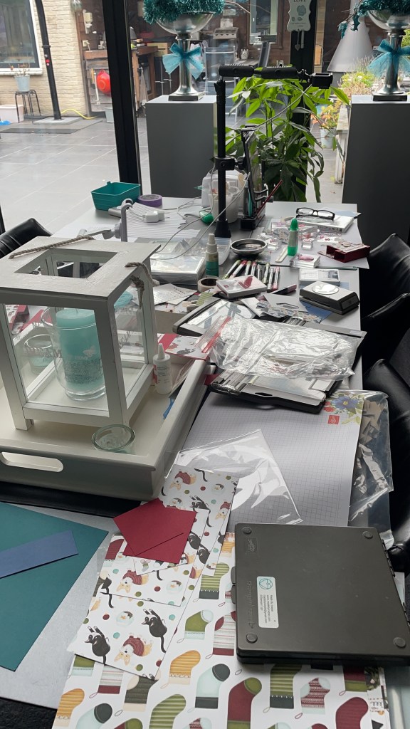 En bij deze hobby hoort ook een ontplofte tafel. Hihi, ik begin altijd zo netjes en geordend aan het maken van mijn YouTube filmpjes. Maar tijdens het creëren maak ik er ( gelukkig buiten beeld) een zooitje van.