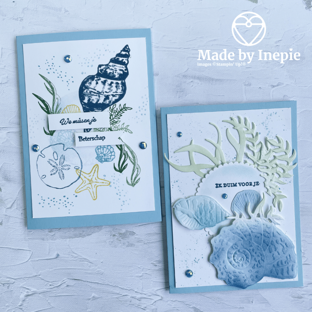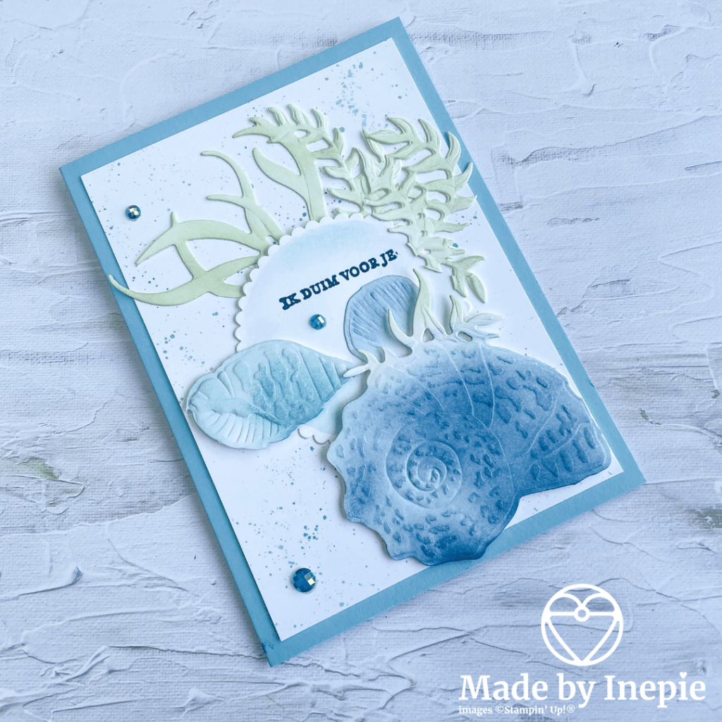 Ik heb nu niet alleen de Friends are like Seashells stempelset gebruikt maar ook de bijbehorende stansenset. De gestempelde cirkel van de Watercolor Shapes heb ik uitgestanst met een scalloped cirkel stans. Met Dimensionals heb ik die op de Basic White mat geplakt die ik eerst bespat heb met wat inkt. Daarachter plakte ik wat uitgeknipte planten. De uitgeknipte schelpen heb ik met mijn blender brush van kleur voorzien. Daarna dezelfde Blingbling toegevoegd als op het kaartje van gisteren. En de tekst komt ook uit de Samen Sterk stempelset.