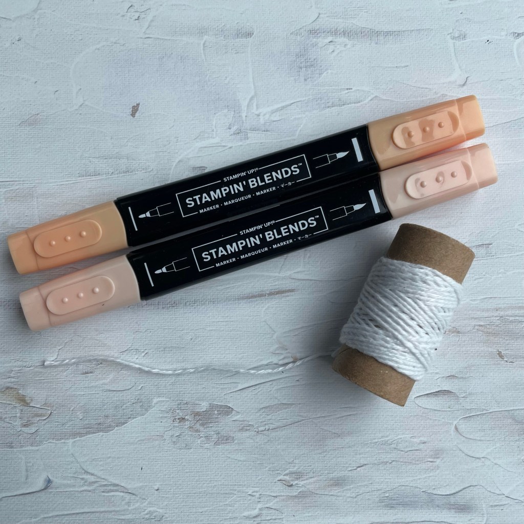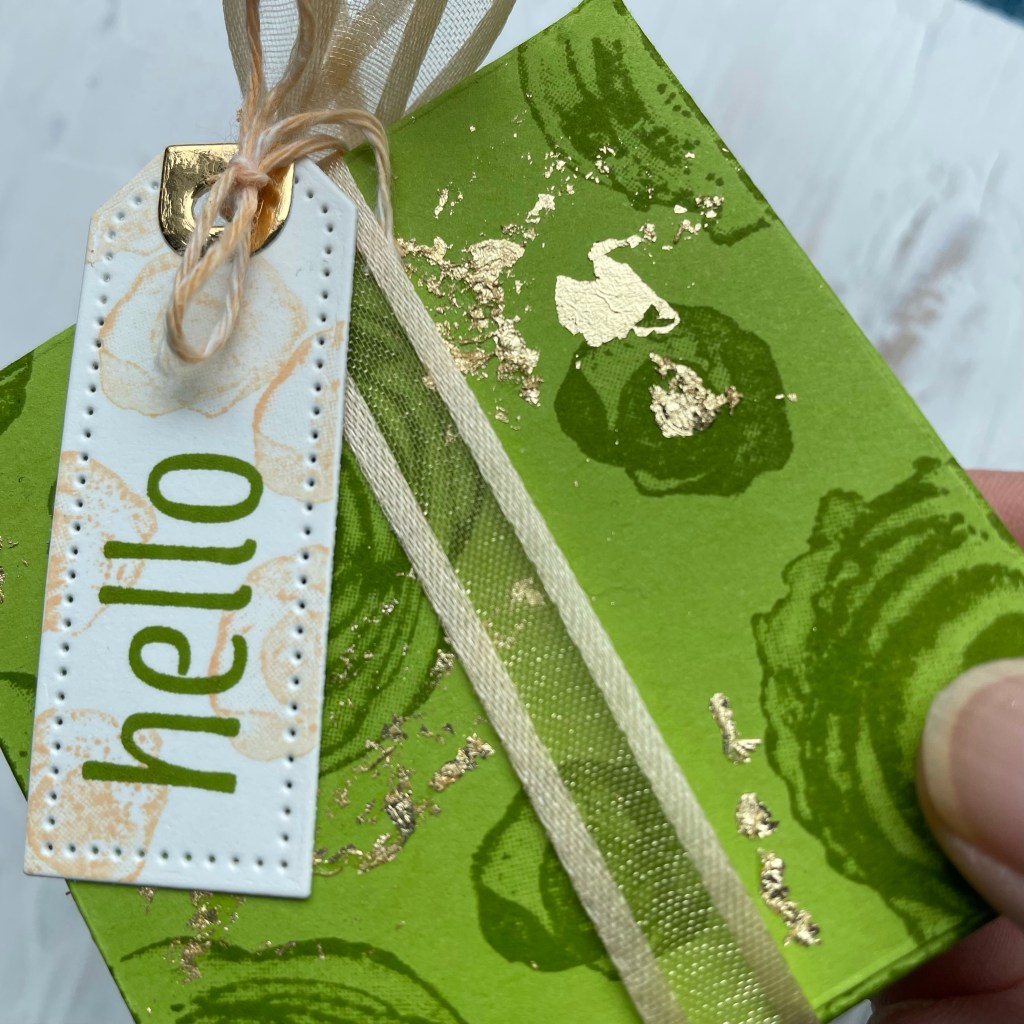 Het labeltje heb ik uitgestanst met de Tailor Made Tags. En ook het gouden oogje heb ik gestanst met de bijpassende stans. De tekst Hello komt uit de stempelset en het kleine bloempje heb ik gestempeld met Pale Papaya maar dan 1 keer afgestempeld. Toen had ik nog een stukje twine nodig en die heb ik met de Pale Papaya Stampin Blend light gekleurd. De Dark werd echt te donker.
