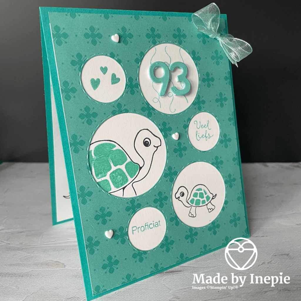 Ik heb de stempelset Turtle Friends hiervoor gebruikt en voor de teksten de Hemelse Hortensia want die heeft hele mooie kleine teksten. Het gebruikte Dsp is de Brights 6” x 6”. In Bermuda Bay net als de basiskaart. De cijfers komen uit de Playful Alphabet dies.
