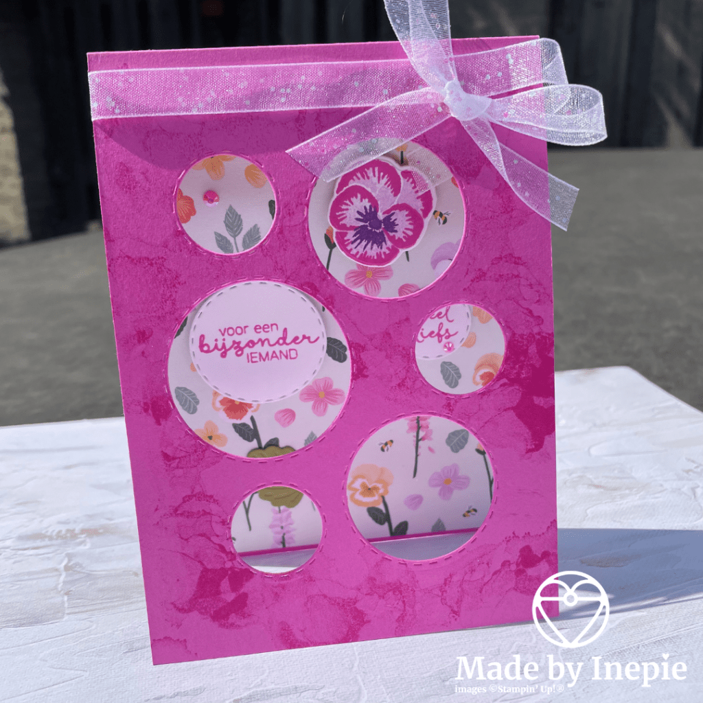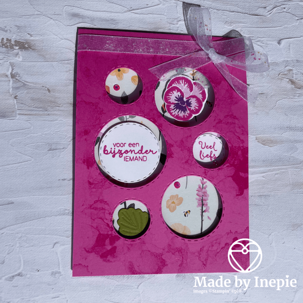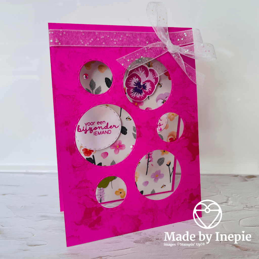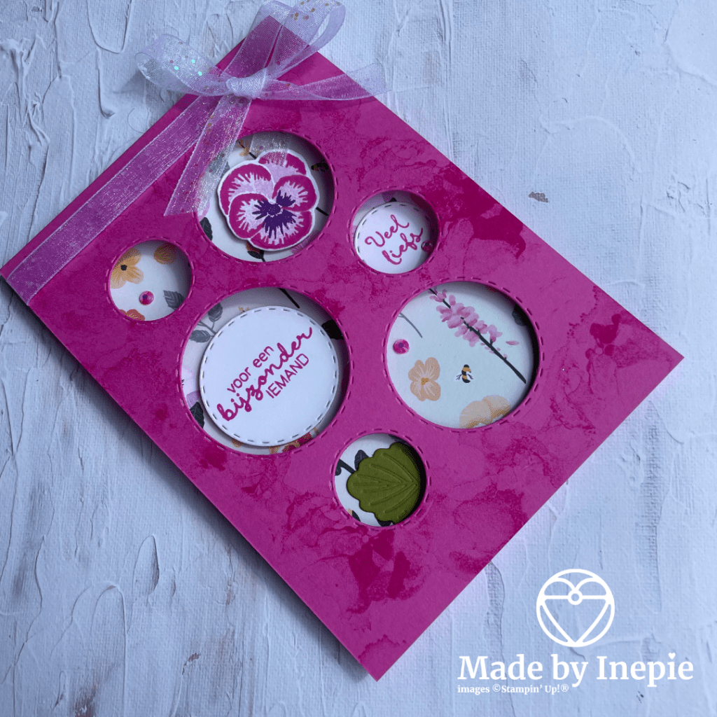 De cirkels heb ik met de Picture This Dies gemaakt. De vlekjes met de Artistically Inked stempelset. En voor de embelliishments heb ik gekozen voor een strik en In Color Jewels. Ik heb gekozen voor Polished Pink cardstock en het Pansy Petals Dsp.