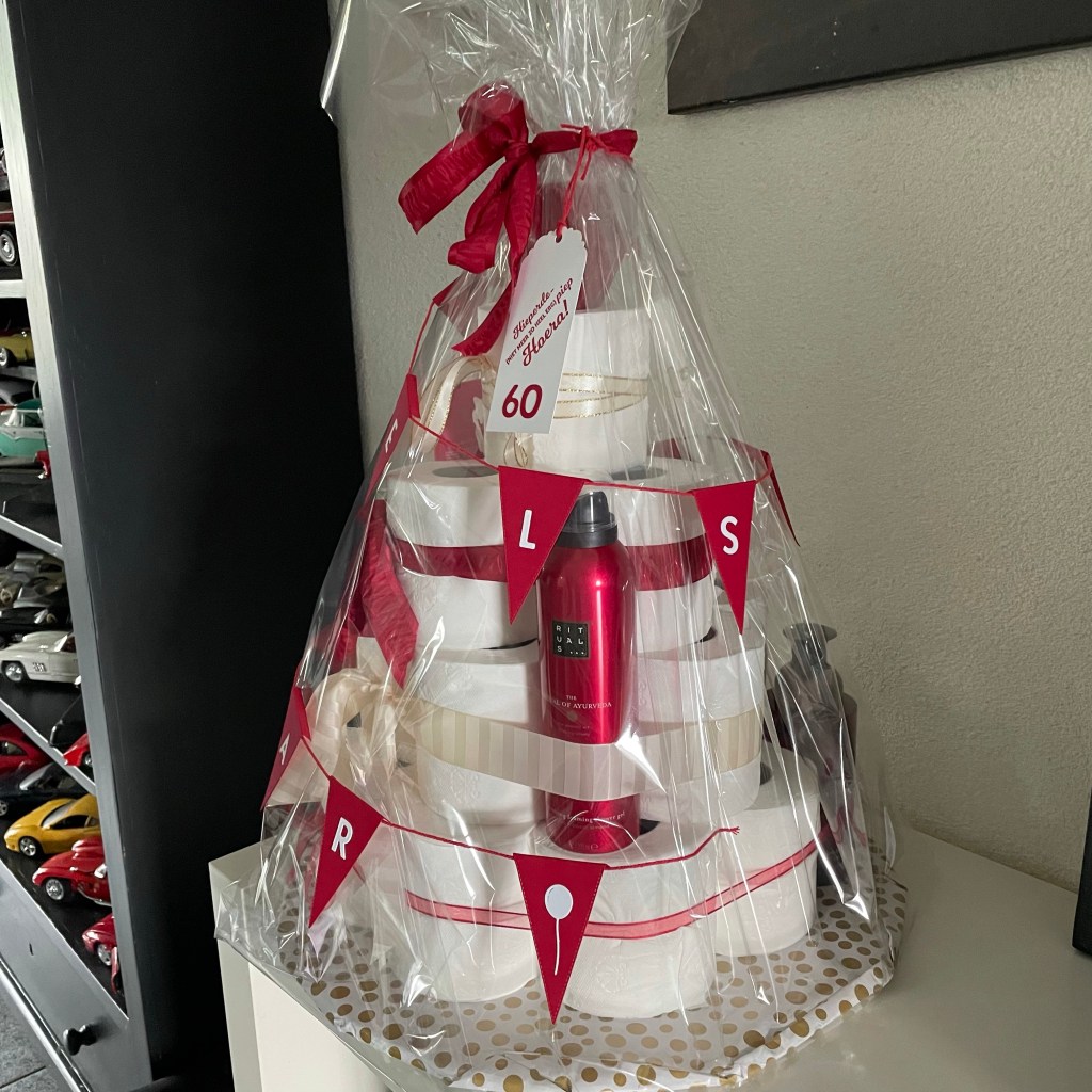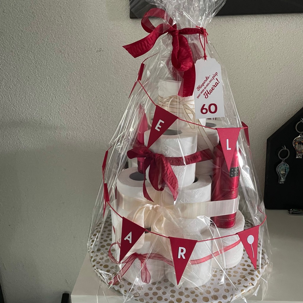Een taart gemaakt van wc-rollen en daartussen de cadeautjes verstopt. Het zag er echt supergaaf uit!