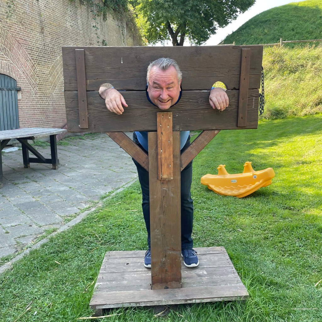 Mooie quote: je wordt verliefd terwijl je naar elkaar glimlacht. Maar je blijft verliefd omdat je met elkaar lacht. En met zo’n vrolijke frans als mijn Willem, lachen we veel af. Op speciaal verzoek van mijn moeder ging hij in het schandblok staan. Wat moest ze er om lachen en ik ook.