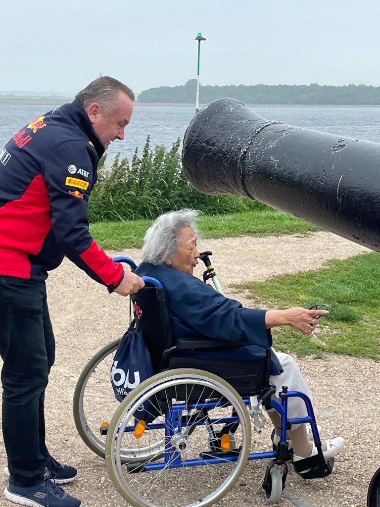 Maar nog meer hou ik van hem als ik zie hoe lief hij is voor mijn moeder. Zonder morren duwt hij de rolstoel al was het soms zwaar want het is een oud ding. Hij maakt haar aan het lachen al kunnen ze samen ook flinke discussies hebben. Allebei vreselijk eigenwijs.
