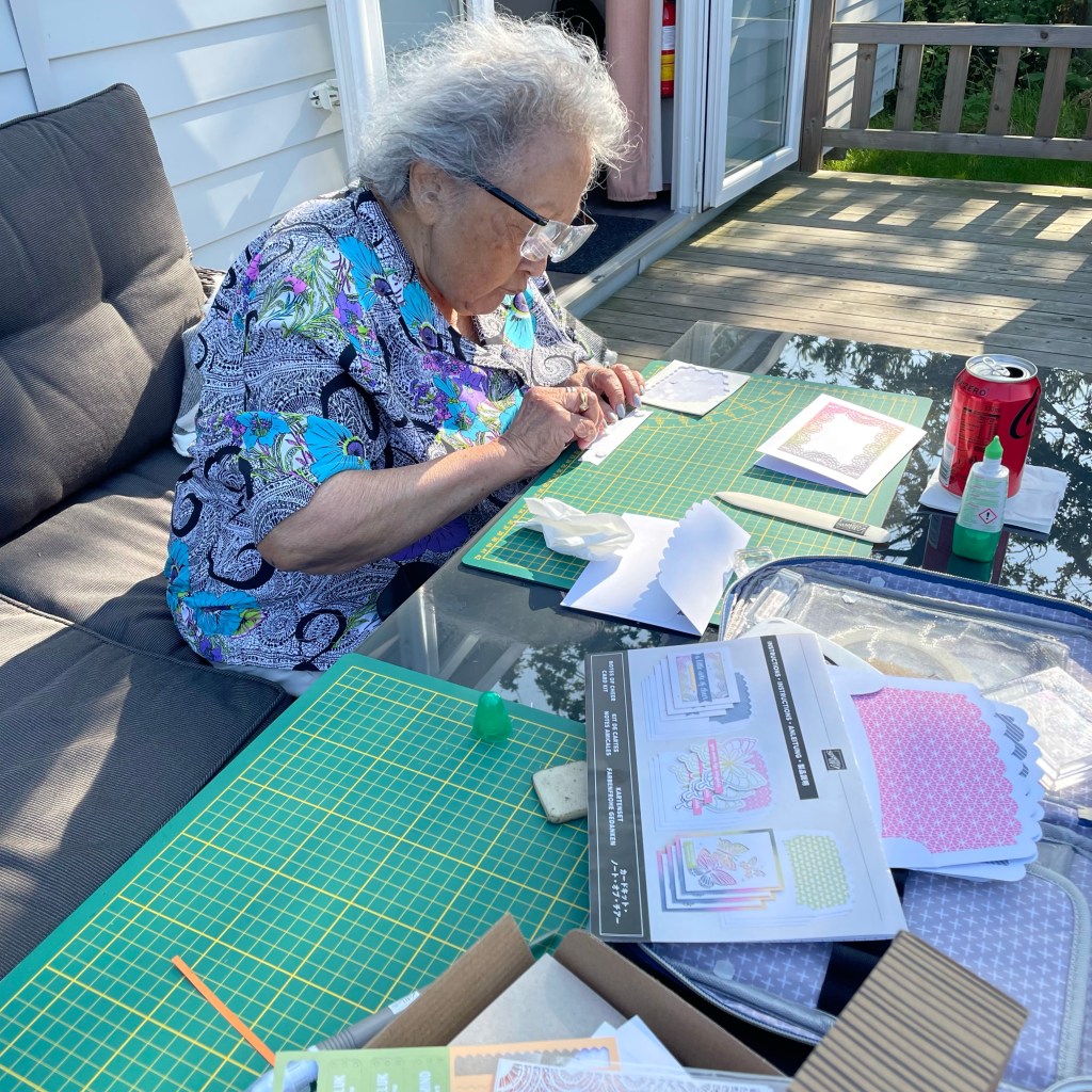 Ze heeft hele slechte ogen maar doordat onze creatieve kits zo mooi en easy peasy zijn lukte het haar om prachtige kaarten te maken. Daar was ze zo blij mee en ik ook. Ze heeft zelfs voor het eerst gestempeld! Trots op haar!