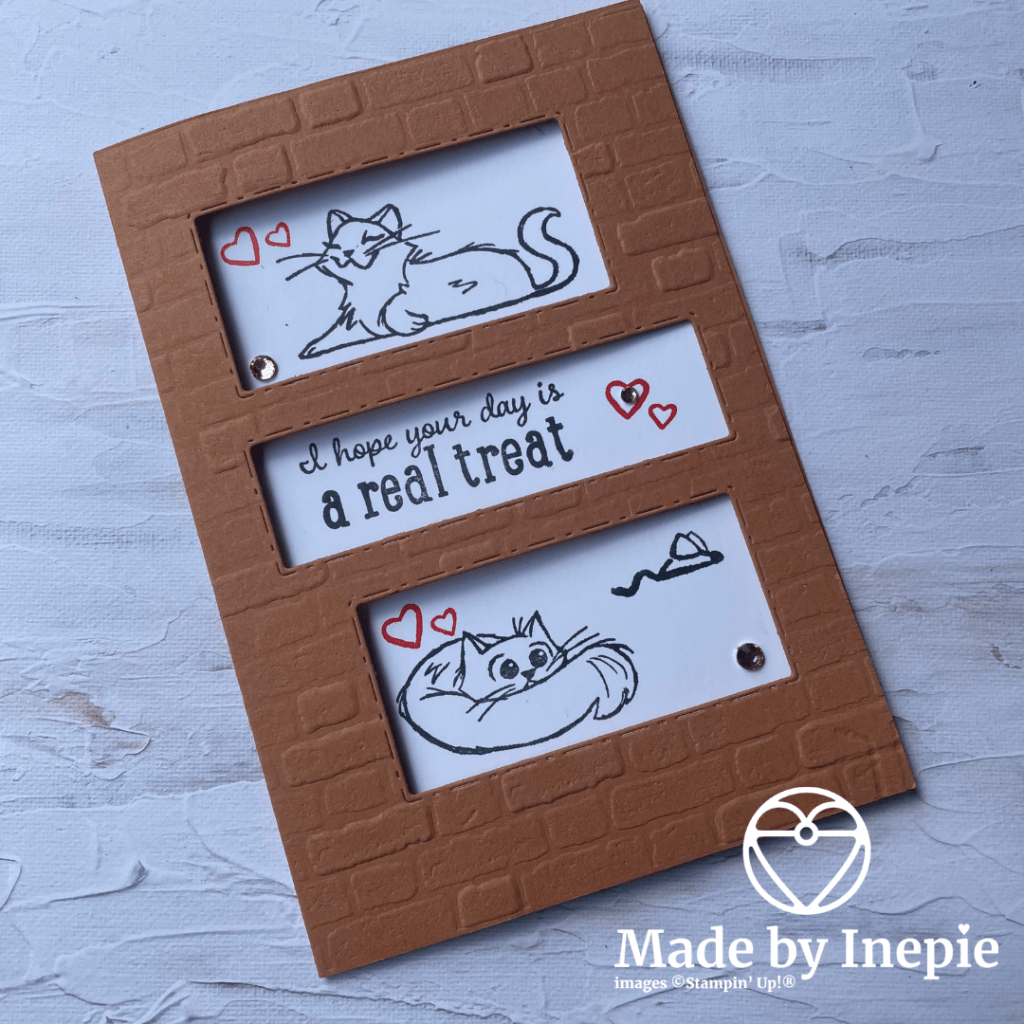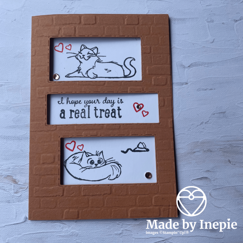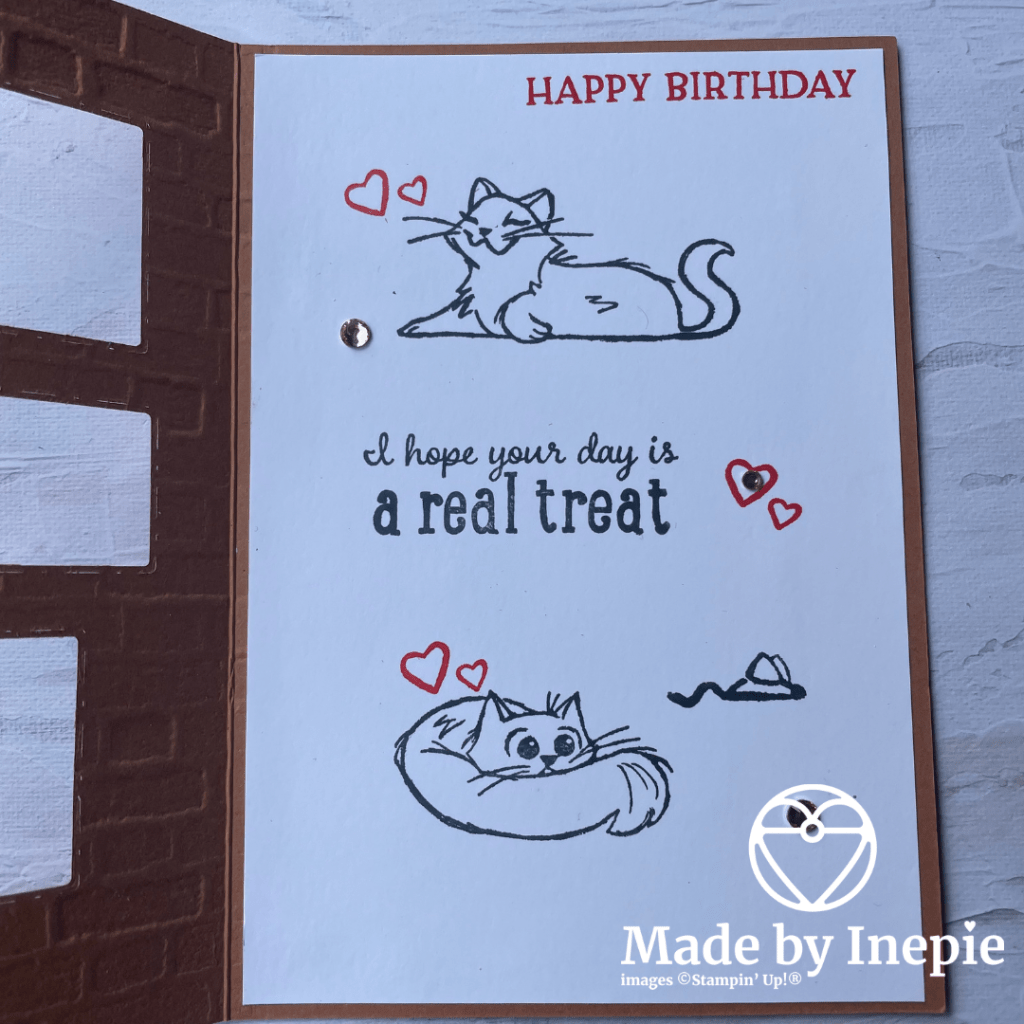 Ik vond dit perfect voor de katten uit de A Real Treat Stempelset. Deze passen echt perfect. Met Real red de tekst Happy Birthday gestempeld en de hartjes. De rest gewoon in Memento Tuxedo Black gestempeld.