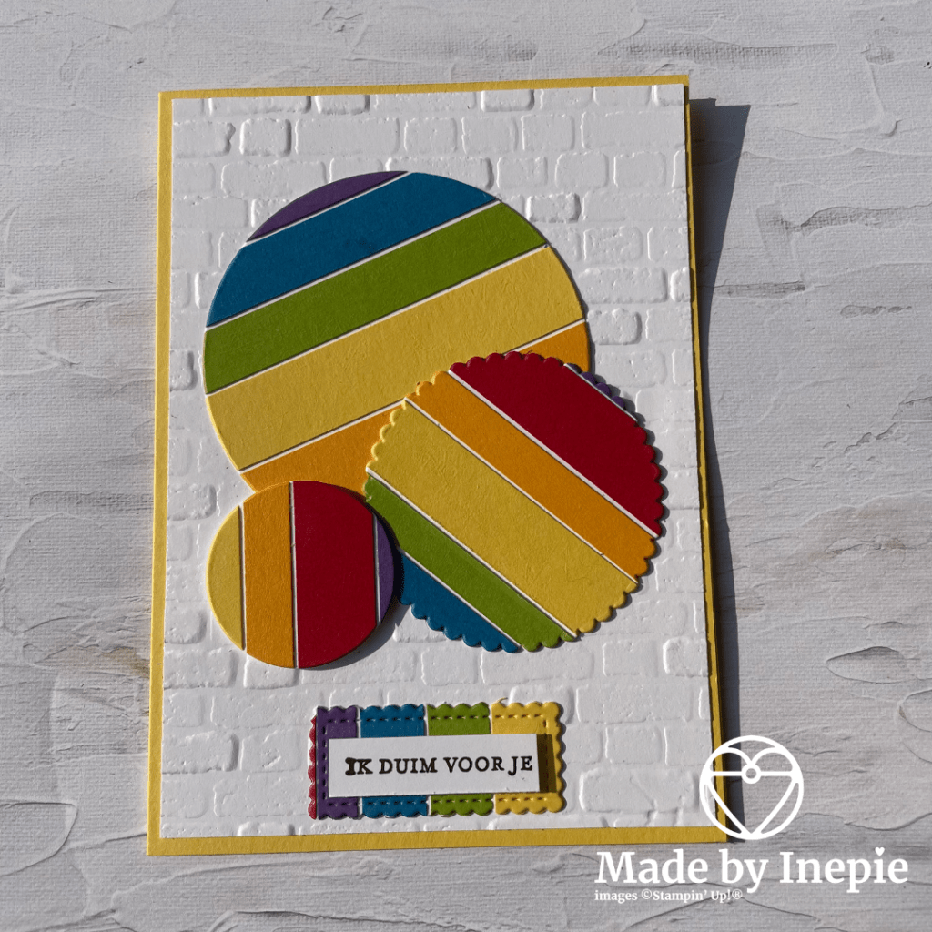 Een tijdje terug liet ik hier een kaartje zien met een achtergrond van reepjes cardstock. Voor dit kaartje heb ik ook weer reepjes op een stuk basic White cardstock geplakt en daarna heb ik drie maten cirkels dies gebruikt om cirkels uit te stansen. En 1 stitched rectangle die. De basis kaart heb ik eerst door de Brick & Mortar Embossing folder gehaald. En daar heb ik de cirkels en de rechthoek opgeplakt