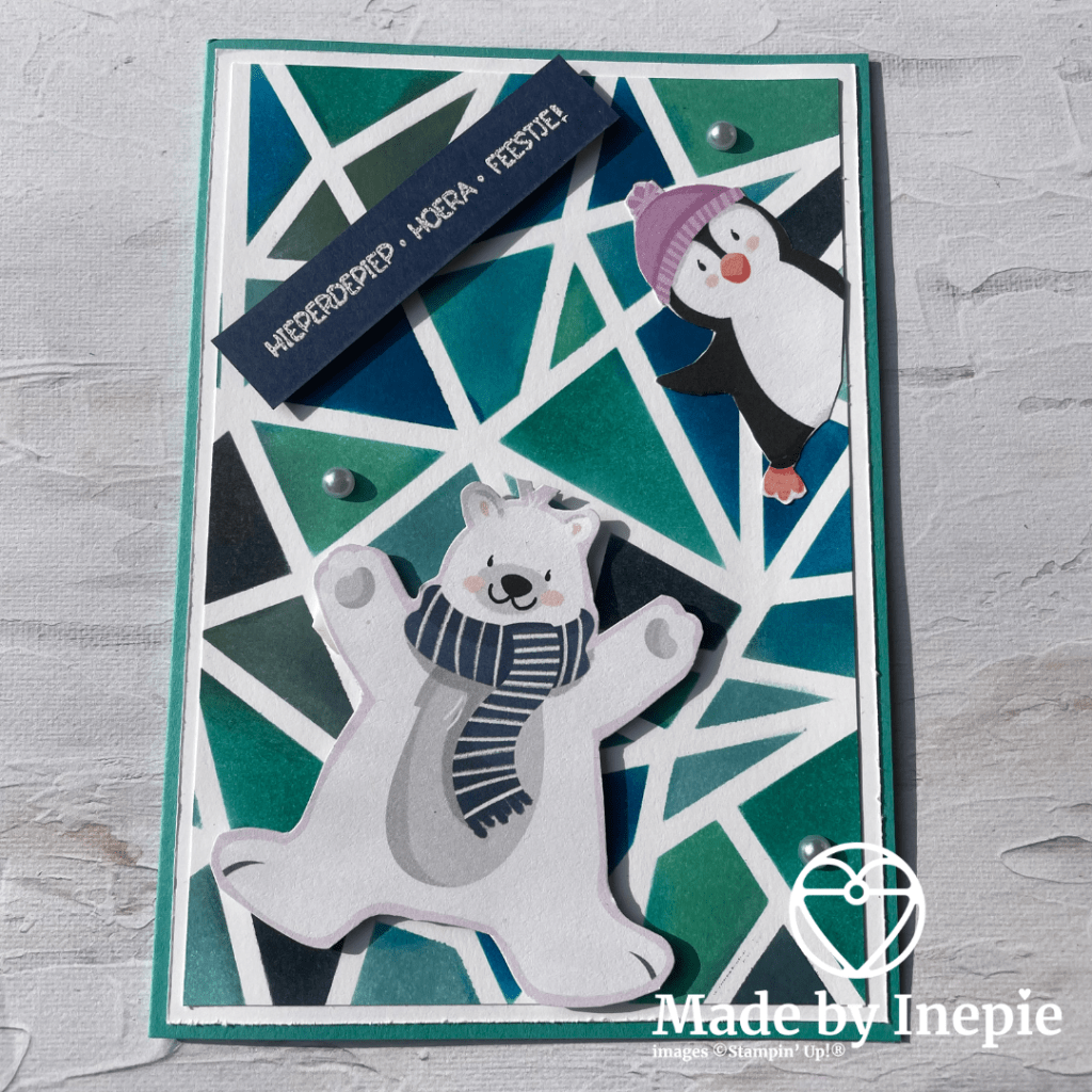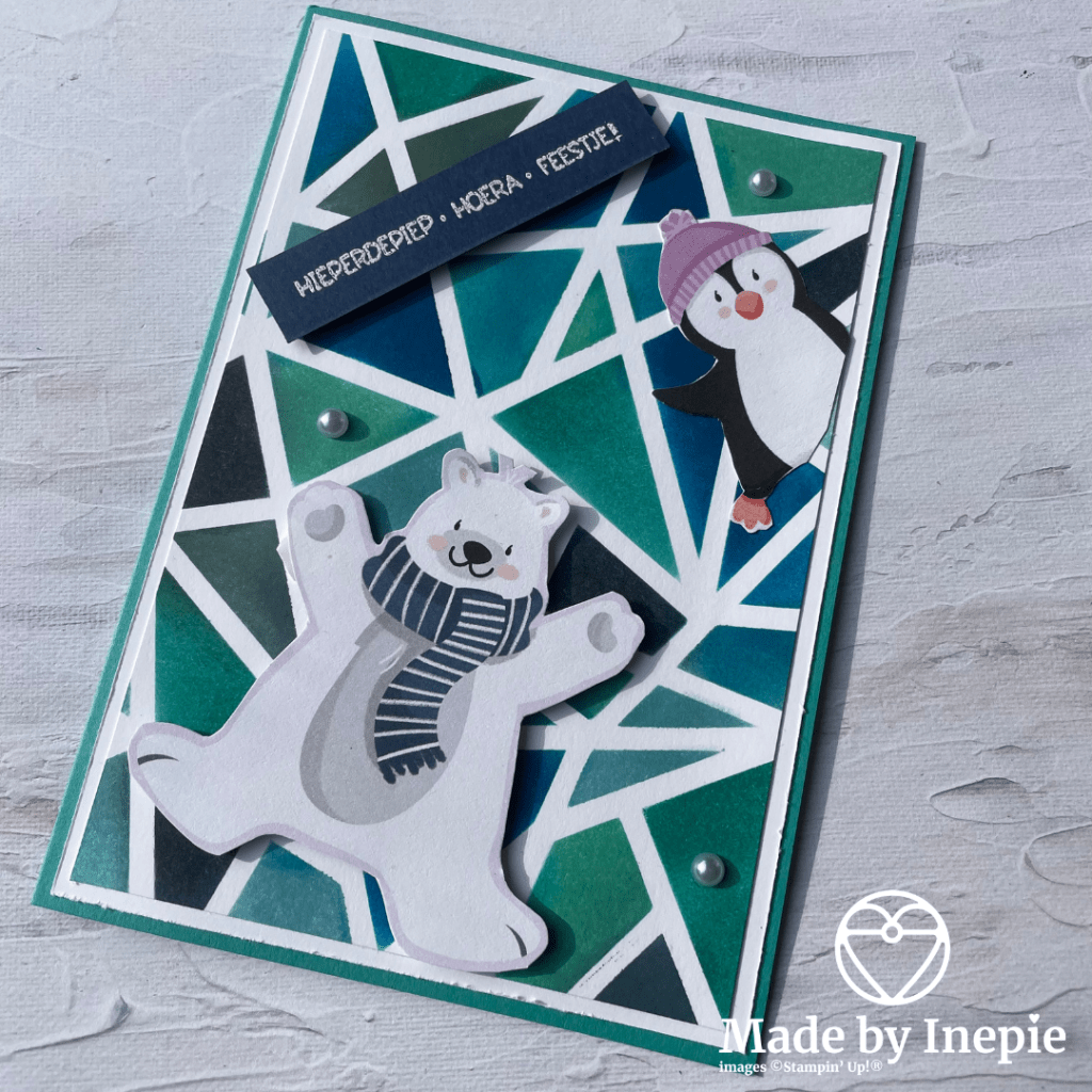 Je zoekt dus 3 of 4 kleurtjes uit en begint met de lichtste kleur. De grote vlakken doe ik met de blending brushes de kleintjes met de spongedauber. Kom je in een ander vlakje is dat niet erg want daar ga je met een donkere kleur overheen en blend je de kleuren. De ijsbeer en de pinquin had ik al uitgeknipt uit het gratis uit te zoeken Pinquin & co Dsp. Nog tot het einde van de maand geldt: bij een minimale besteding van €60,00 mag je een gratis product uit kiezen uit de Sale-A-Bration folder. De pinquin was niet helemaal heel, maar op dit kaartje kon ik hem zo mooi gebruiken. Te mooi om weg te gooien. De tekst komt uit de stempelset Penquin Pret en hier kun je ook een bijbehorende pons bij kopen. Als je deze als bundel koopt krijg je 10% bundel korting en kost het €38,50. De blending borstels kosten €14,50 per 3 stuks en doe je daar een setje sjablonen bij (€9,75) dan zit je al over de €60,00 en mag je dus het mooie Dsp ( of iets anders uit de Sale-A-Bration folder) uitkiezen. Je vindt deze producten in mijn online shop madebyinepie.stampinup.net( klik op de foto’s onder aan mijn bericht en je gaat rechtstreeks naar mijn shop) of stuur mij een mailtje of messenger bericht en ik help jou graag verder.