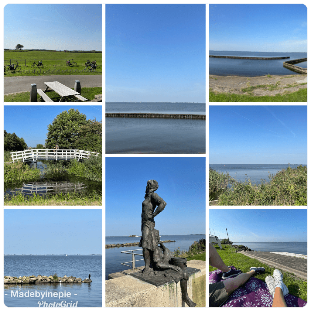 Vandaag alweer ons laatste dagje in Lemmer vanmiddag vertrekken we naar Grou. Daar blijven we ook 3 dagen. En dan nog 3 dagen Giethoorn. 3 was mijn mans geluks getal dus hopelijk ook weer veel zon. We zijn echt enorme bofferds met het weer. En gisteren heb ik afgerekend met een jeugdtrauma. Wij hadden vroeger geen geld om op vakantie te gaan. Mijn oudere zus was verloofd met een jongen en die had een auto. Mijn jongste broertje, ik en zijn stiefbroertje mochten ieder een dagje uit kiezen. Ik koos ervoor om naar de film te gaan want daar hadden wij ook nooit geld voor, mijn broertje wilde naar Safari park de Beekse Bergen en dat stiefbroertje wilde naar: het Tjeukemeer. Nou werden mijn broertje en ik altijd vreselijk wagenziek dus die lange rit van Den Bosch naar Friesland was geen grapje. Kwamen we eindelijk aan bij het Tjeukemeer was het snert weer, hij keek 5 minuten rond en zei: zo ik heb het gezien. En konden we weer dat hele takke eind terugrijden. Ik had hem het liefste in het Tjeukemeer geduwd. Dus iedere keer als iemand het over het Tjeukemeer had kreeg ik daar negatieve energie van. Nou maar nu niet meer. Gisteren zijn we helemaal rond het Tjeukemeer gefietst en wat was het prachtig! Na 45 jaar kan ik eindelijk dat jeugdtrauma vaarwel zeggen. Heerlijk om zo mooie herinneringen samen te maken.