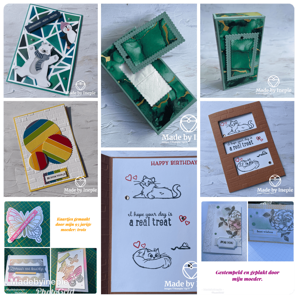 Hierboven vindt je het weekoverzicht. Leuke projecten weer. De mooiste vind ik deze keer de kaarten van ons mam. Wat zijn onze creatieve kits toch geweldig dat zelfs een vrouw van 93 die nog nooit gestempeld heeft zulke mooie eindresultaten behaald. Onze allernieuwste Paper Pumpkin Expressions In Color is geweldig! Heb jij hem al besteld? Zo niet help ik jou graag!
