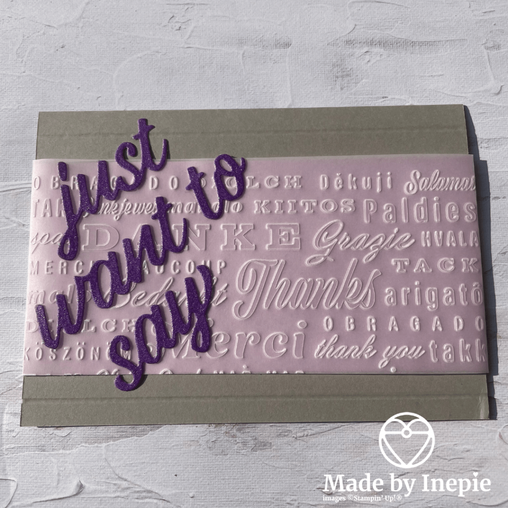 Ik had de Thanks & Hello Embossing folders eigenlijk over het hoofd gezien. Maar wat zijn ze leuk! Ik heb de Thanks folder gebruikt op een stuk Shimmer vellum. Deze zijn verkrijgbaar in de In Color 2021-2023 kleuren. Je vindt ze op bldz 135 van de jaarcatalogus. En het geeft echt een prachtig effect.