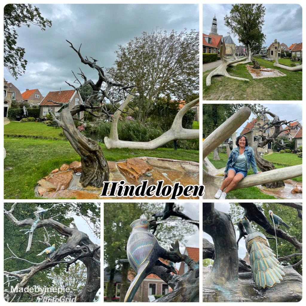 Jammer dat de potvis in Harlingen stuk was en geen water spoot. En de ijsfontijn in Dokkum was vies, waarschijnlijk door een feest van de dag ervoor, er lag allemaal hooi op en er kwam maar een beetje stoom uit. Maar bijvoorbeeld de vis in Stavoren leek mij niet mooi en was prachtig net als de levensboom in Hindelopen, zo mooi met tropische vogels. Ik ga nog meer collages maken maar vandaag niet: vandaag gaan we varen in Giethoorn met een fluisterboot. Fijne dag,