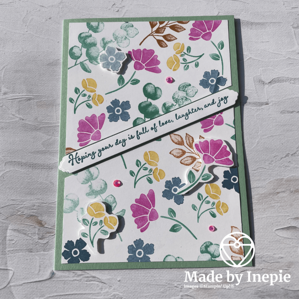 Ik heb de mat doormidden gesneden en zo op de kaart geplakt dat er een sentiment tussen kon, deze had ik ook al klaar liggen. Want deze komt uit de stempelset Many Messages en heb ik uitgestanst met de Messages Dies. Ideaal zo heb je altijd een stapeltje teksten klaar liggen. Ik heb nog wat bloempjes gestempeld en op geplakt met Dimensionals, nog wat Blingbling erbij en mijn restjes kaart was weer klaar.