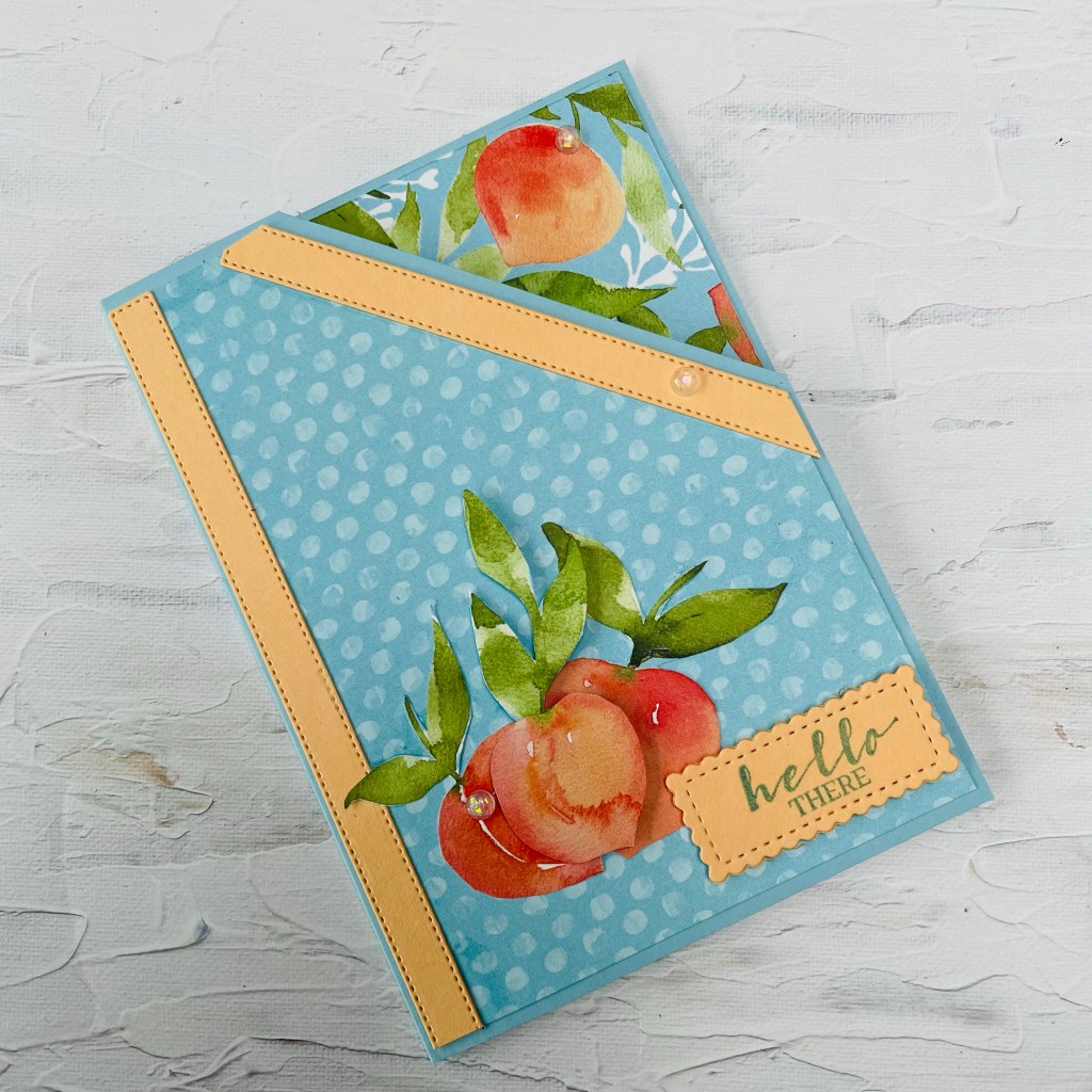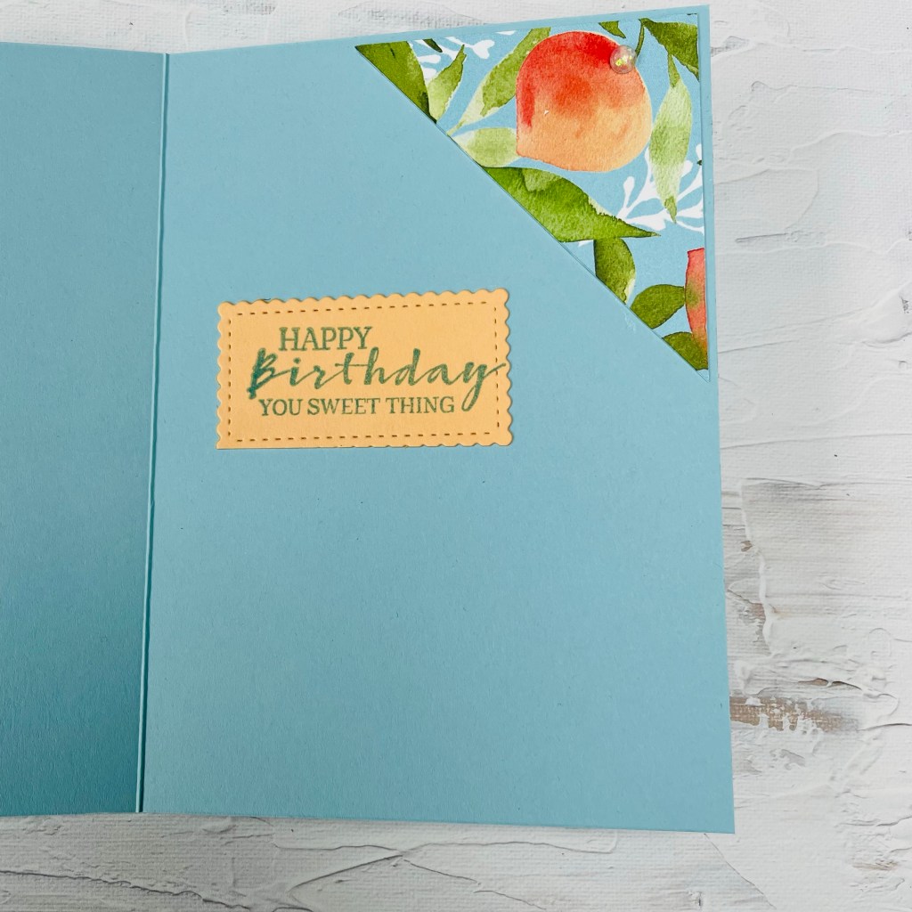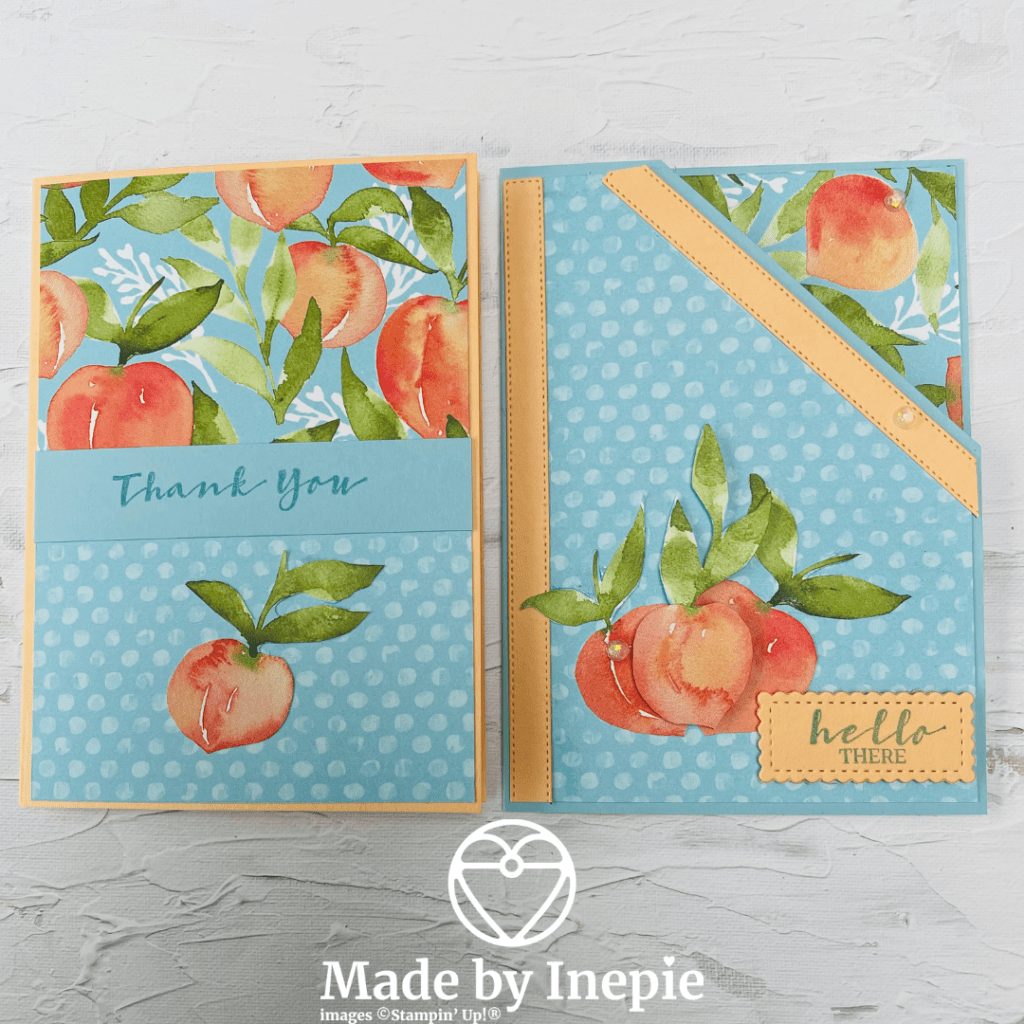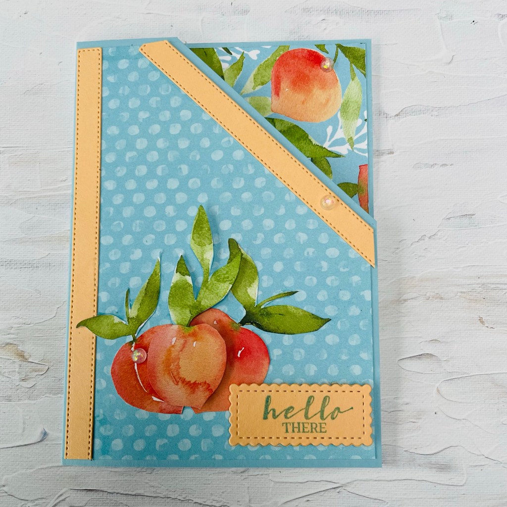 Vandaag weer een kaartje met het mooie You’re a Peach Dsp. Alleen heb ik nu stansen gebruikt en een eenvoudige funfold gemaakt. Ik heb van de basiskaart aan de voorkant een driehoek weggesneden. De voorkant beplakt met Dsp. En binnen in de kaart in de hoek een driehoek Dsp geplakt die ik van de voorkant overhield.