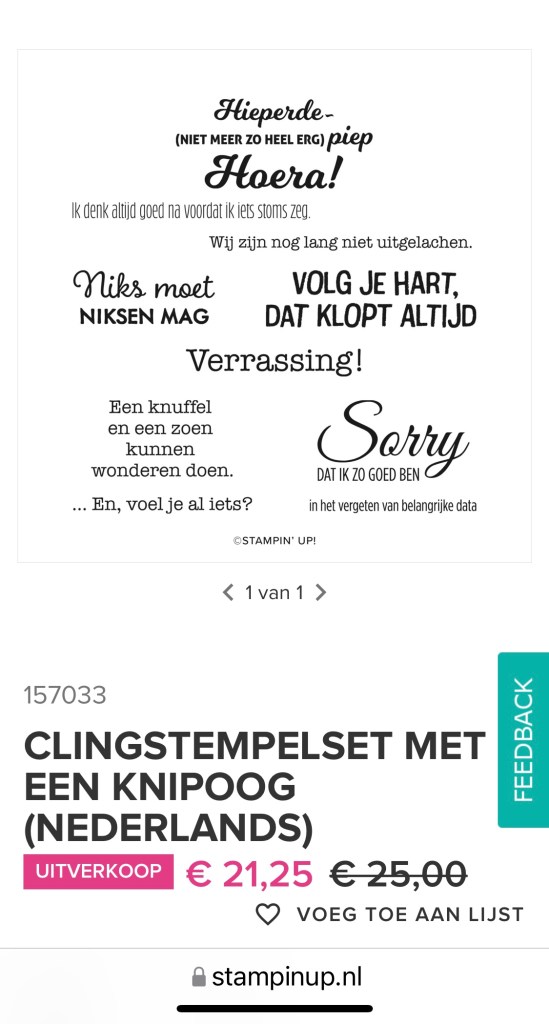Bijvoorbeeld deze geweldig leuke Nederlandse stempelset. En er zijn nu 7 Nederlandse stempelsets in de aanbieding: dus sla je slag! In mijn onlineshop kun je via creditcard of Pay Pal betalen. Als ik de bestelling voor jou plaats kun je via een bankoverschrijving of tikkie betalen. Of eventueel zelfs contant als je bij mij in de buurt woont. Let op deze actie is maar 1 dag geldig. Ik ga zeker morgen bestellen dus laat het mij op tijd weten.