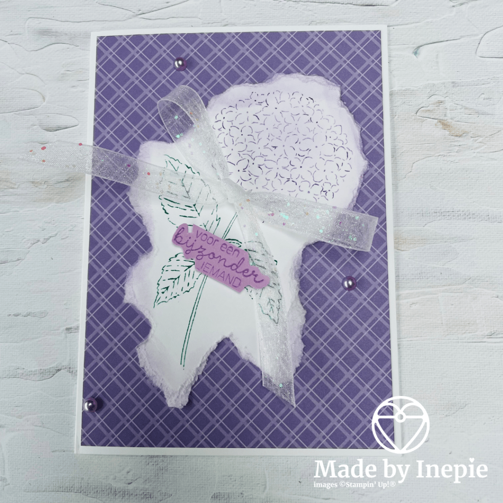 Op een basiskaart van Basic White heb ik een mat geplakt van het 6” x 6” Subtles Dsp. Daarop de Hortensia geplakt met liquid glue. Een strik toegevoegd van een stuk White Glittered Organdy ribbon en de tekst uit de stempelset met Highland Heather op een rest stukje Fresh Freesia gestempeld en uitgeknipt met mijn Paper Snips. Dan deze met Dimensionals opgeplakt, nog 3 Pastel Parels erbij en mijn mooie Makkelijke Maandag kaartje was klaar.