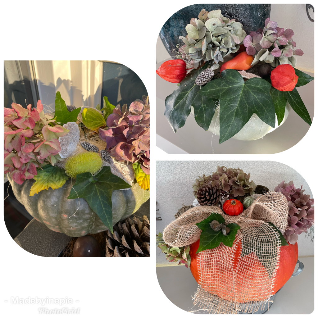 Dit weekend ben ik lekker bezig geweest met pompoenen te pimpen met Hortensia’s. Ik was er speciaal voor naar mijn dochter gefietst om er daar 4 af te knippen. Maar op de terug rit kwam ik langs een bladeren korf en daar had iemand al zijn afgesnoeide Hortensias in gegooid. Natuurlijk heb ik toen mijn fietstas vol gegooid. Thuis lekker geknutseld met dit als resultaat: