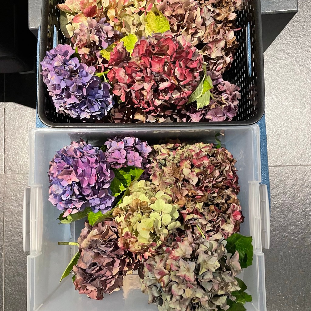 S’avonds zat ik op de bank en dacht t’is toch zonde: ik fiets er nog een keer langs en heb nog wat Hortensia’s gered. Daar wil ik nog een mooie krans meemaken.