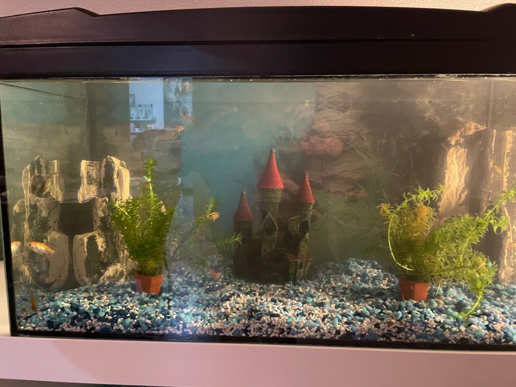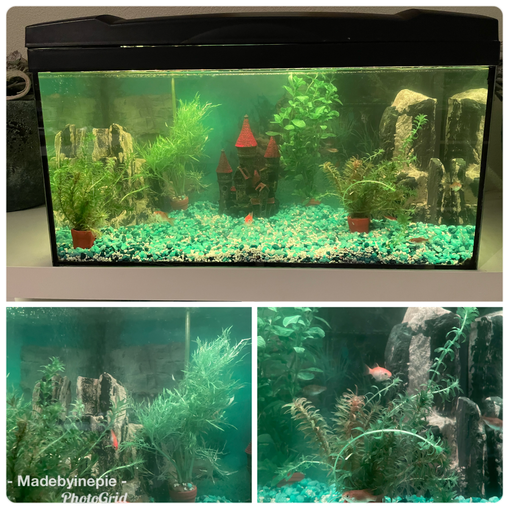 Ik wilde heel lang geen aquarium: vroeger een jeugdtrauma opgelopen. Wij hadden een gigantisch tropisch aquarium ( later is die naar een chinees restaurant gegaan) maar we hadden van die domme visjes die uit het kleine voedergat sprongen en die lagen dan s’ochtends op het linoleum. Plus soms hadden ze ziektes en het aquarium stond in de eetkamer en dan verging mij de eetlust. Misschien lust ik daarom wel geen vis. Maar sinds Willems 50 ste verjaardag hebben wij een vijver en geniet ik van onze vissen dus nu toch een aquarium en ik vind het leuk!