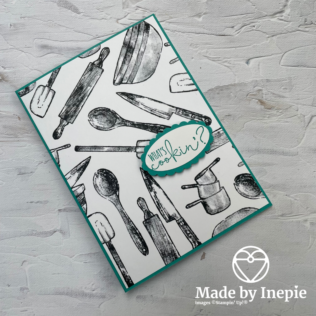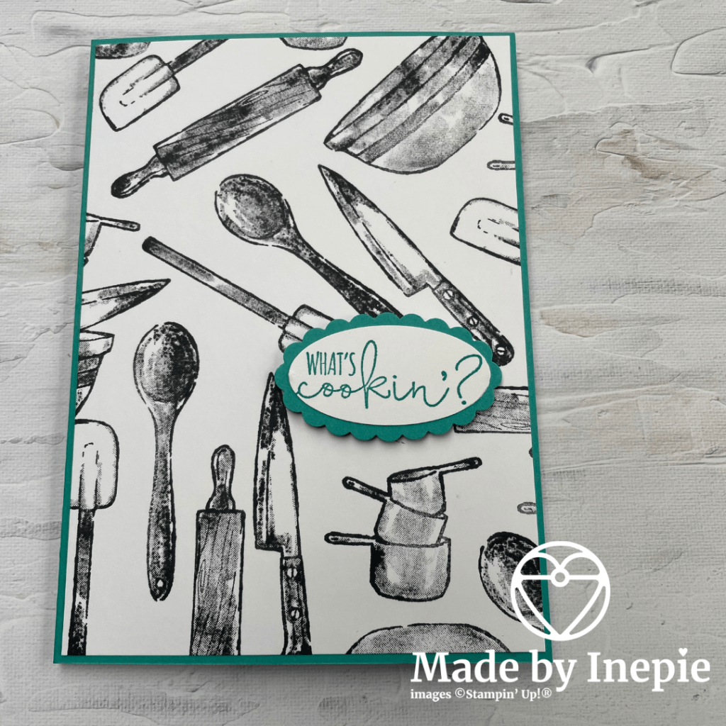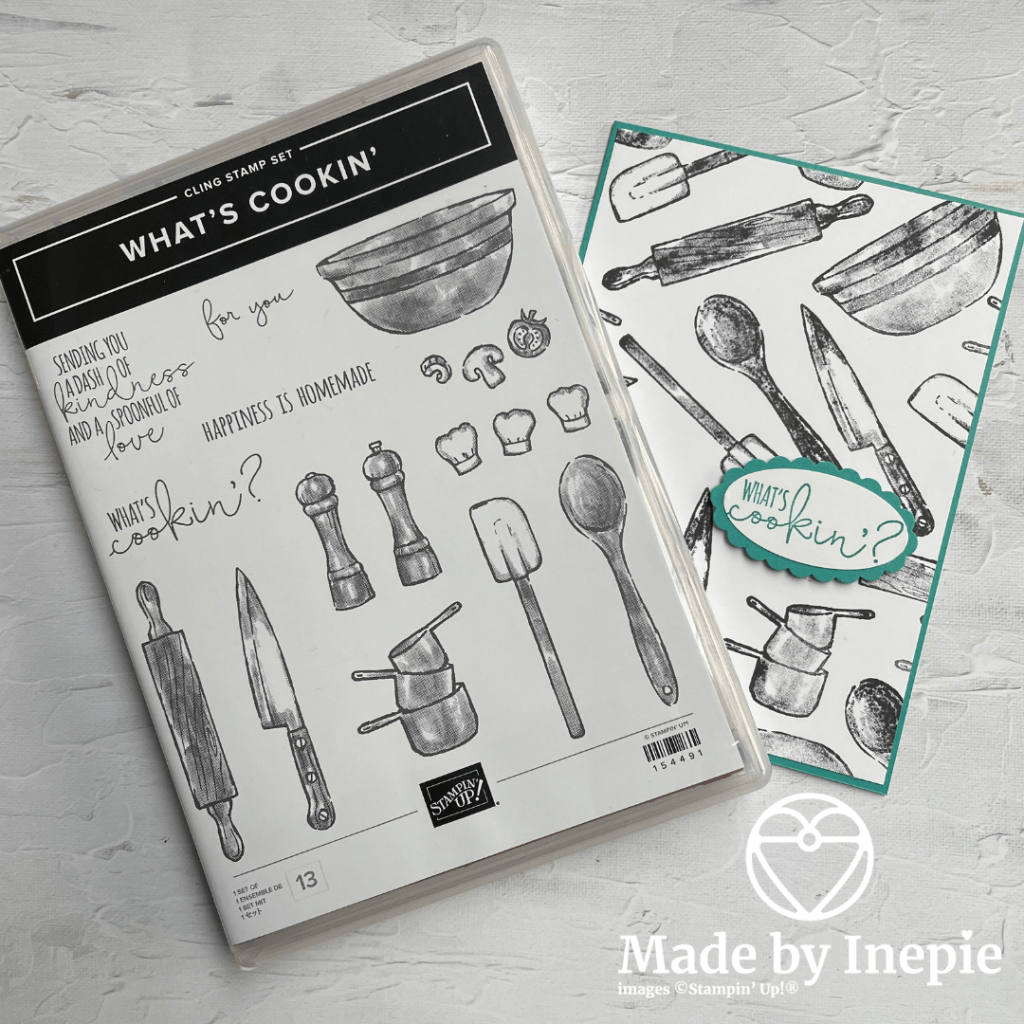 Hij lag al even op mijn bureau en nu eindelijk tijd gehad om ermee te spelen. De leuke What’s Cookin stempelset. Ik besloot om er lekker mee te stempelen op Basic White met mijn Memento Tuxedo Black inktpad.