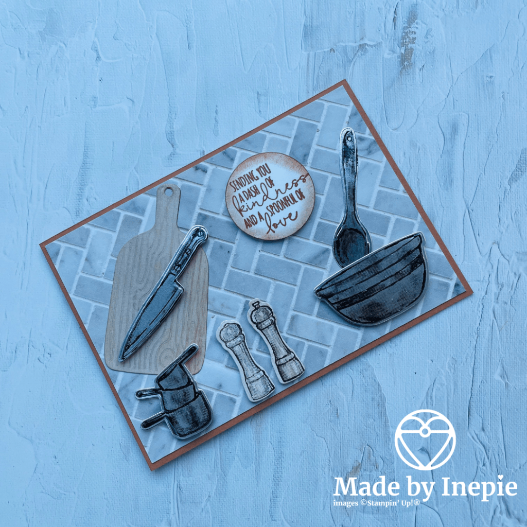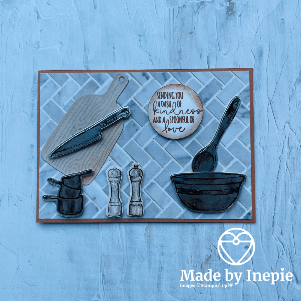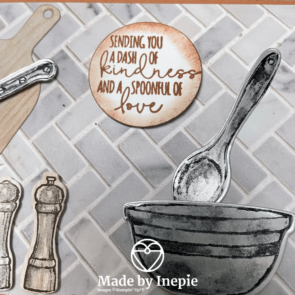 Als extra zit er ook een snijplank bij en een klopper. De snijplank en het peper en zout stel heb ik op een stuk In Good Taste dsp vel gestempeld die met het houtstructuur. Ik vond hem bij de snijplank te licht dus heb ik met een blending brush wat Cinnemon Cider er heel lichtjes op gedaan. Op het rondje met de tekst heb ik er wat meer kleur opgedaan.