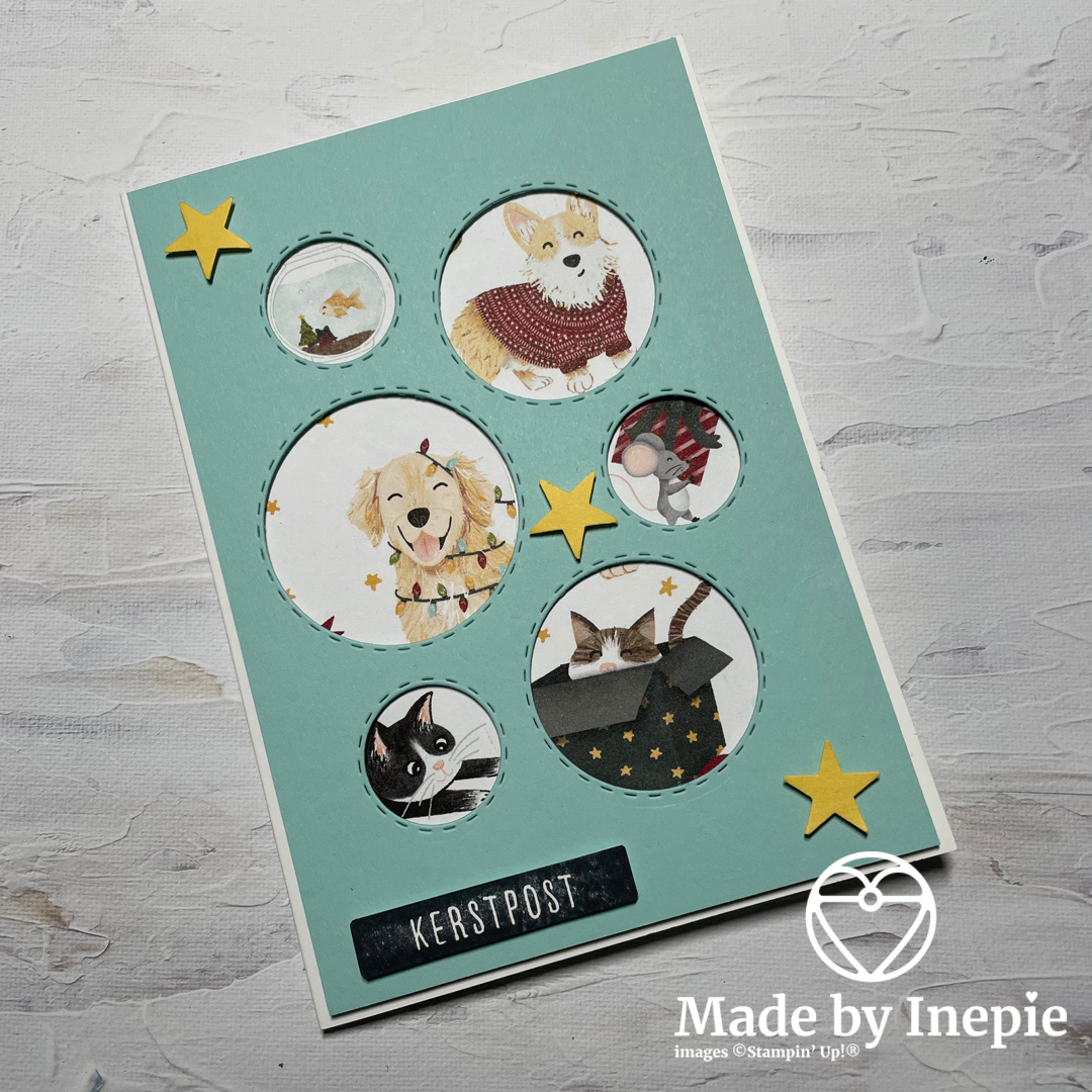 Ik heb een basiskaart in Basic White genomen daarbovenop een mat van Pool Party waar ik de stans met de rondjes op heb gebruikt. Er onder heb ik stukjes Dsp geplakt van de schattige diertjes uit het Sweet Stockings Dsp. Super cute toch?