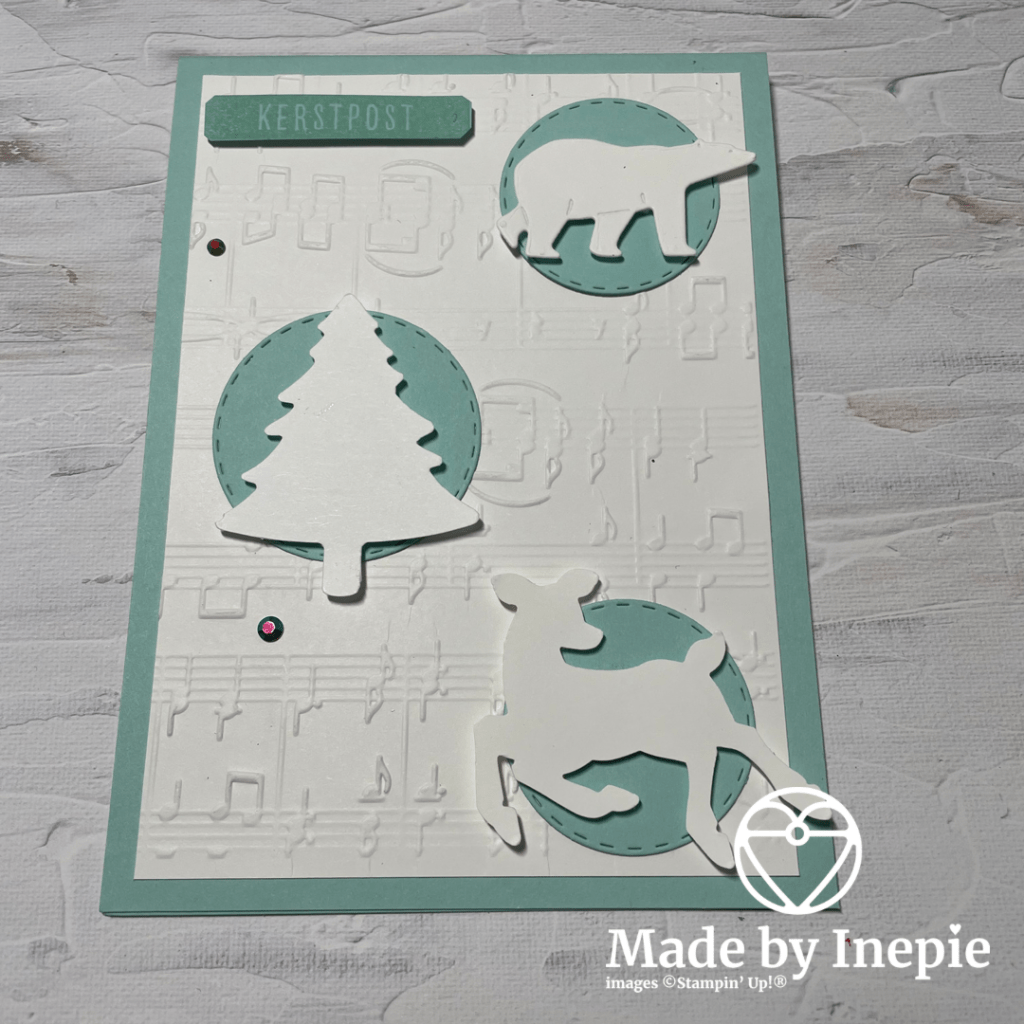 Deze op de kaart geplakt en toen 3 cirkels erop geplakt. Met mijn Pine Tree pons en mijn Deer Builder pons uit Basic White de figuurtjes uitgeponst en met Dimensionals opgeplakt. De ijsbeer komt uit de Polar Bears Dies.