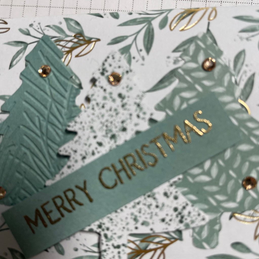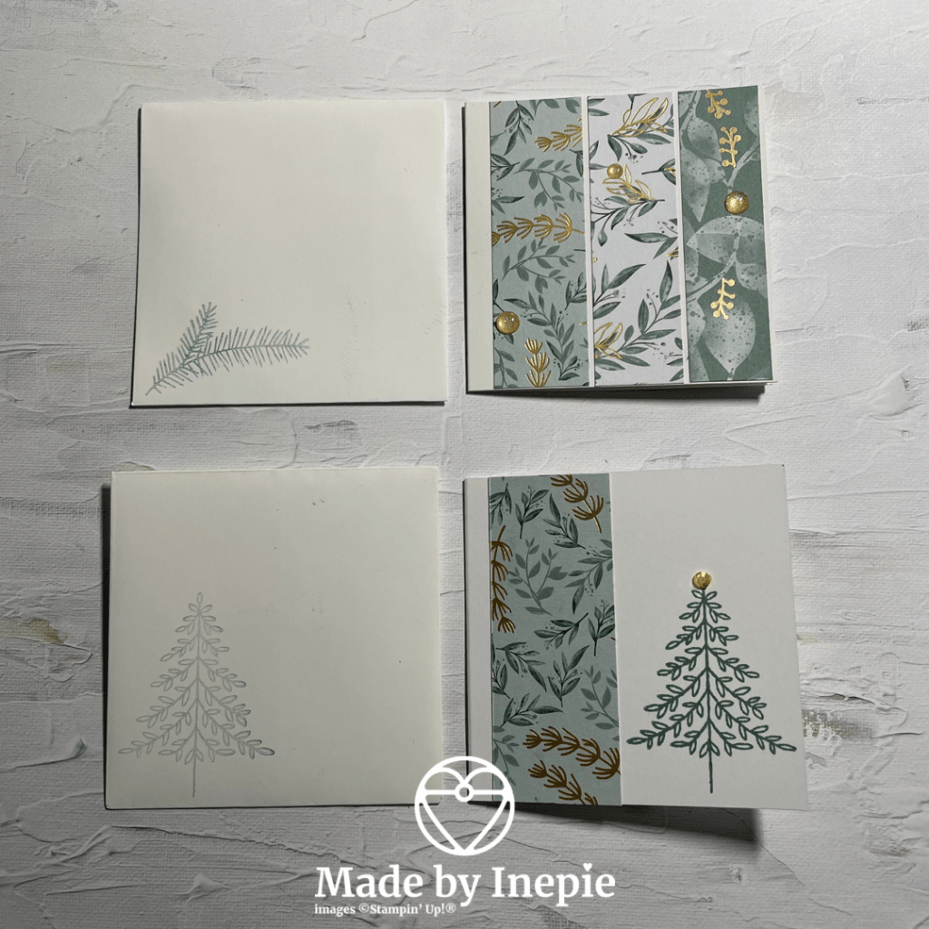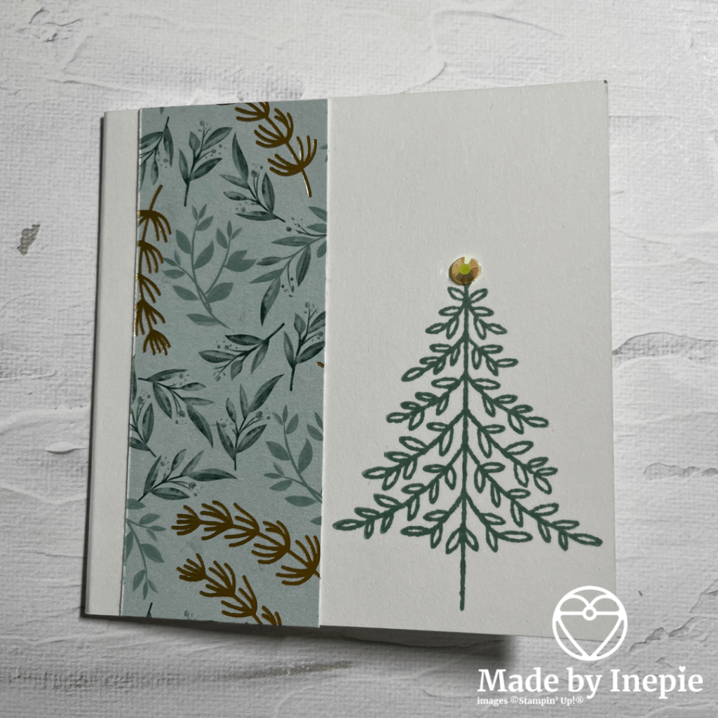 Bij deze heb ik een reststrook opgeplakt en daarnaast een kerstboom uit de set Perfectly Plaid. ( bldz 93 van de jaarcatalogus) Hier hoort een bijbehorende Pine Tree pons bij en die gebruik ik heel vaak voor mijn kerstprojecten. Maar nu vond ik een stempel alleen al mooi .1 Elegant Faceted Gem erop en mijn minikaartje was alweer klaar.