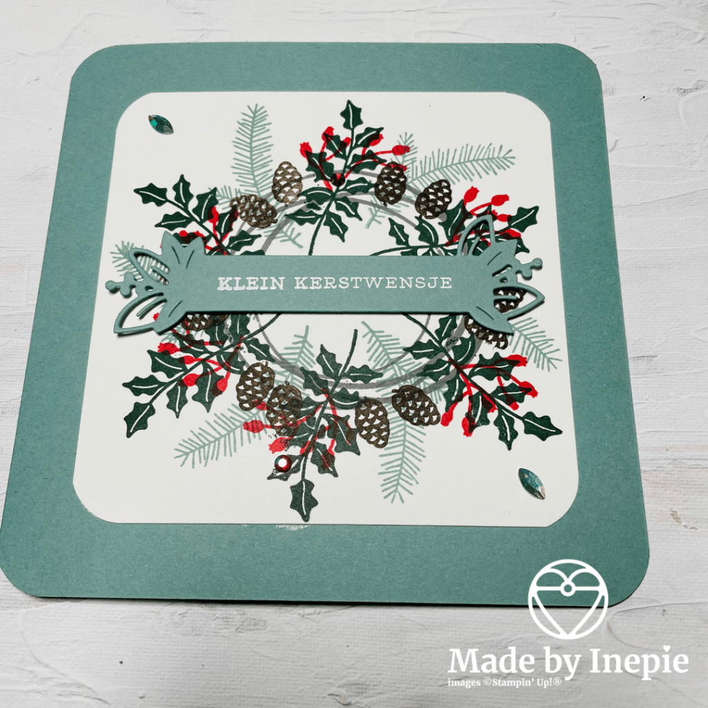 Ik heb heerlijk in de rondte gestempeld met de set Sparkle of the season. Eerst de open cirkel en dan met de takjes en denneappels een krans gemaakt: superleuk om te doen.