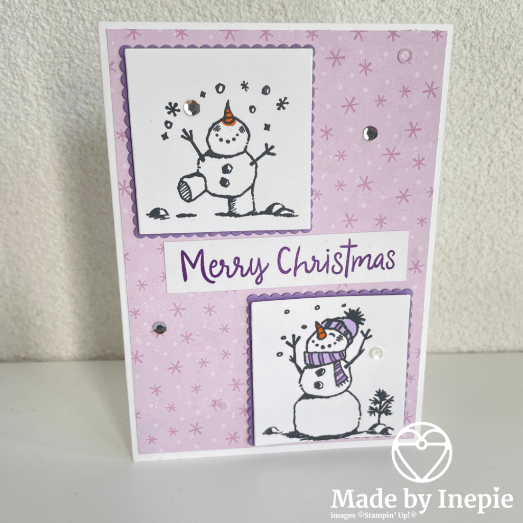 Vandaag ook dit kerstkaartje gemaakt voor een vriendin. Ze vond hem super schattig en was er blij mee! Kijk daar doe je het voor. Het Dsp is van de Pinquins en de sneeuwmannen heb ik uitgestanst met de layering Squares. En uit Higland Heather heb ik nog de gegolfde vierkanten gestanst om eronder te plakken. Nog wat Subtle Shimmer sequins opgeplakt en mijn kaartje was klaar.