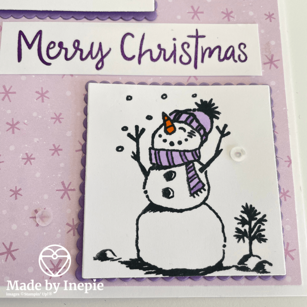 Deze keer de muts en das in gekleurd met de Highland Heather Stampin Blends ipv de Bermuda Bay Stampin Blends van het kaartje.