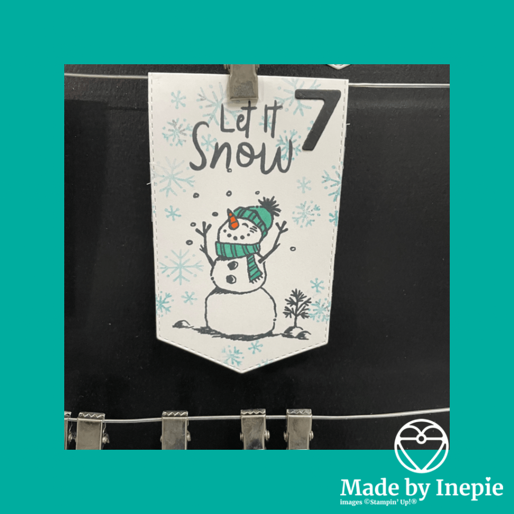 Vandaag voor dag 7 van het aftellen naar Kerst bord een vrolijk kaartje met de grappige sneeuwman uit de stempelset: Snowman Season. Gestempeld met memento en ingekleurd met Stampin Blends. Ook de tekst en de sneeuw vlokken komen uit de set.