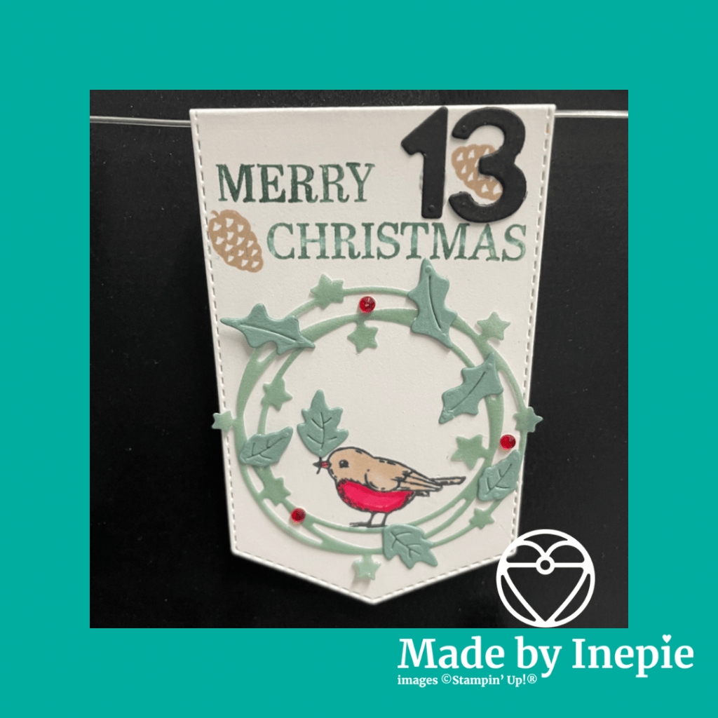 De krans heb ik uitgestanst met de Seasonal Swirls dies. En daar komen ook de blaadjes uit. Zo jammer dat deze set er weer uit gaat. En ook de stempelset Sparkle of the season. Deze kost nu nog maar €10,50 .