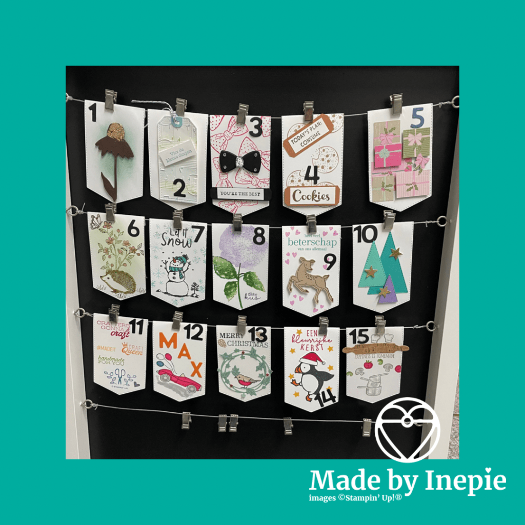 Mijn bord raakt aardig vol: nog maar 2 rijen. Ik geniet er zo van: al die leuke kleine kaartjes. Ik ben ook druk met de gewone kerstkaarten te maken. Moet er nog 50. Wel heerlijk om te doen. En niet alle 50 hoeven met de post mee. Maar kan ik zelf bezorgen. Scheelt toch weer in de kosten.