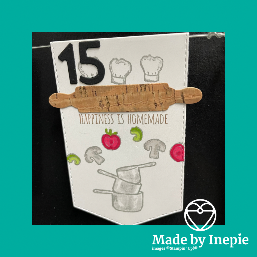 Vandaag weer even met de geweldige set What’s Cookin’ gespeeld voor kaartje nr 15. Zo leuk en deze keer heb ik de deegroller uit kurk papier uitgestanst: mooi he!