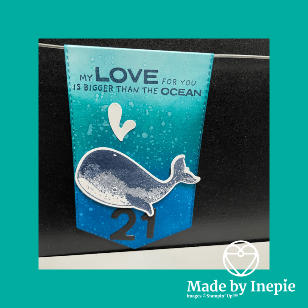 Omdat ik toch al vieze vingers had is het kaartje voor mijn aftelbord ook zo gemaakt. Alleen heb ik er nu de walvis van de Whale Done stempelset op geplakt. Natuurlijk de bijpassende pons gebruikt. Ook de tekst komt uit de stempelset. Ik vind het een prachtig kaartje geworden.