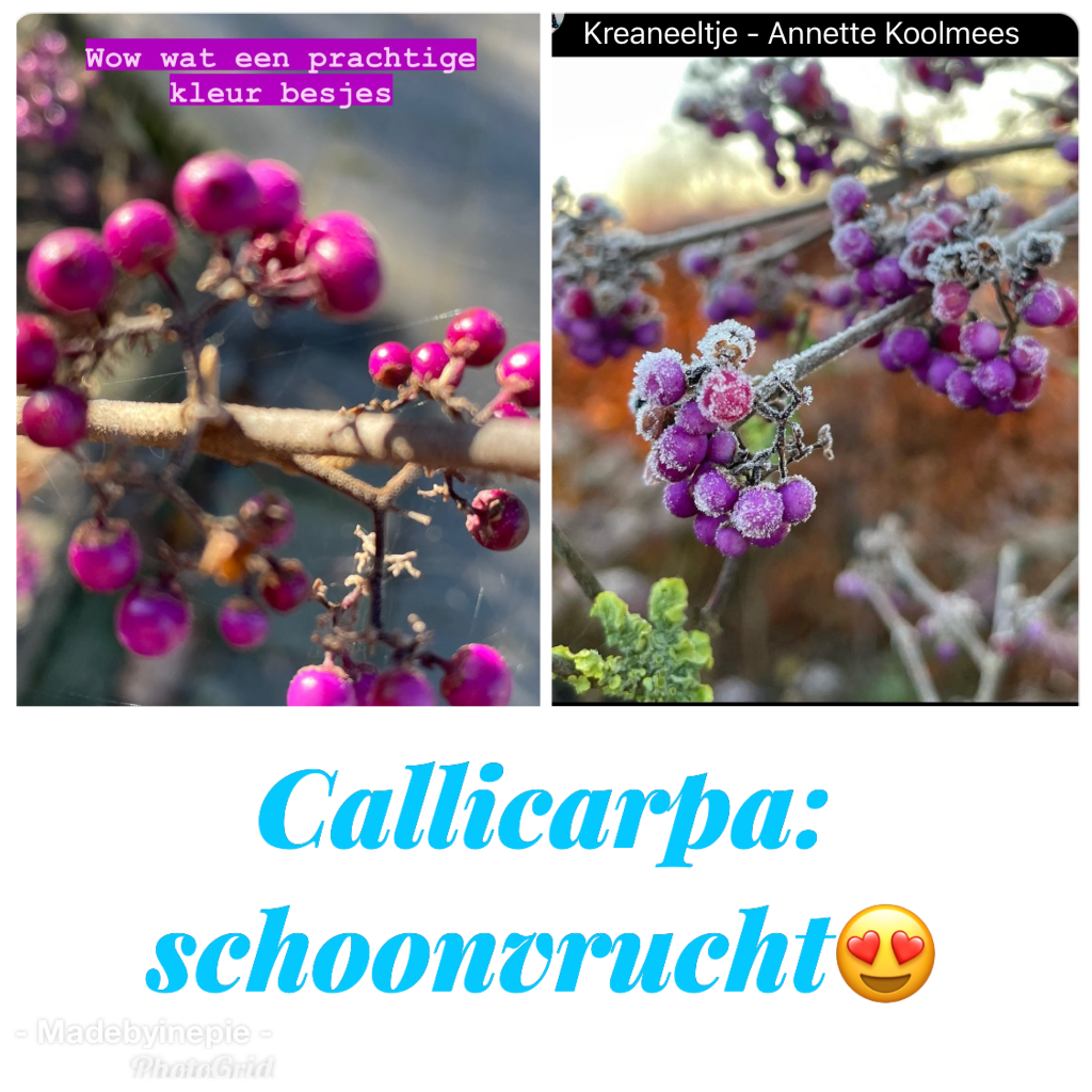 Mijn kaartje van vandaag is geïnspireerd door de mooie besjes van de Callicarpa. Deze plant staat op mijn verlanglijstje. Ik vond ze in de herfst al mooi maar met de rijp erop: prachtig. Dankzij Anette Koolmees weet ik hoe ze heten en hoe mooi ze zijn in de winter.