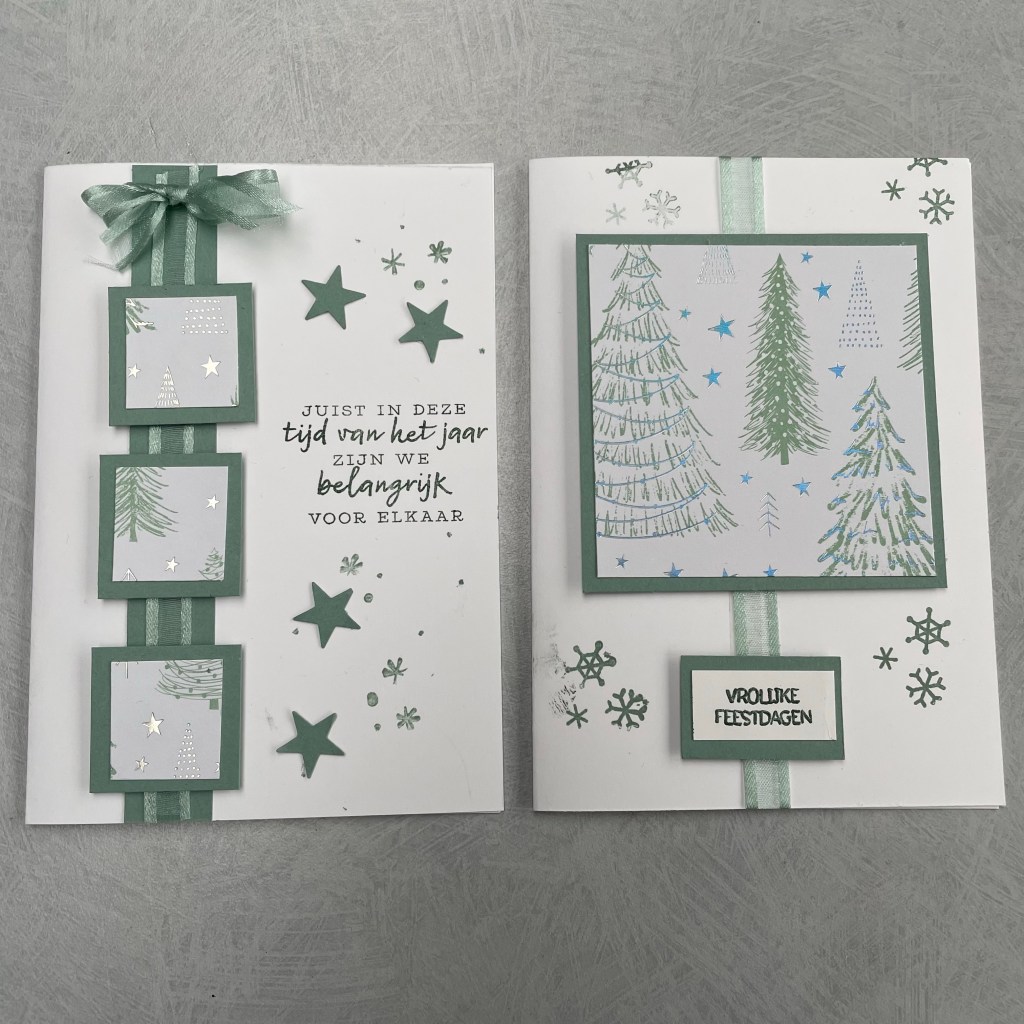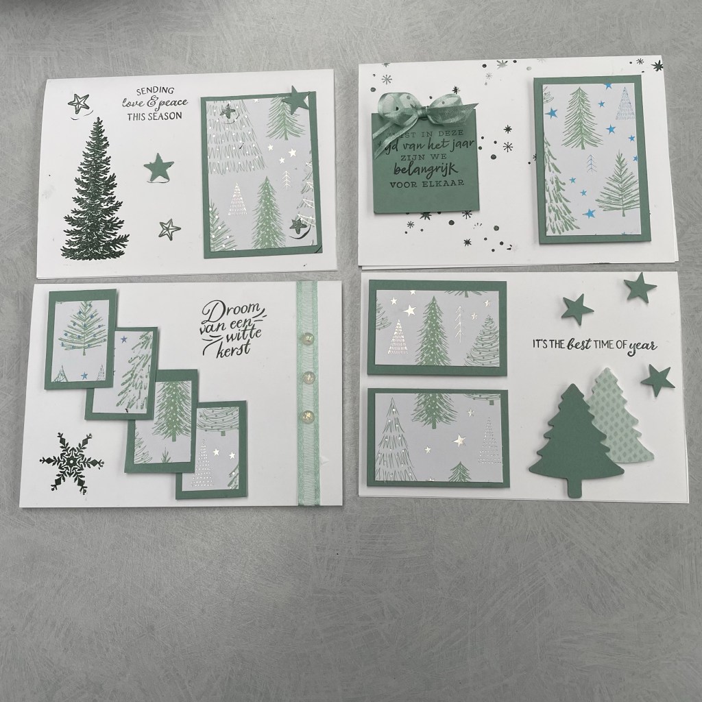 Dit was een one sheet wonder van een stukje Dsp van 6” bij 6”. Het leuke is dat de kaarten compleet anders eruit zien bij een andere Dsp keuze. Of door een andere kleur cardstock als mat.