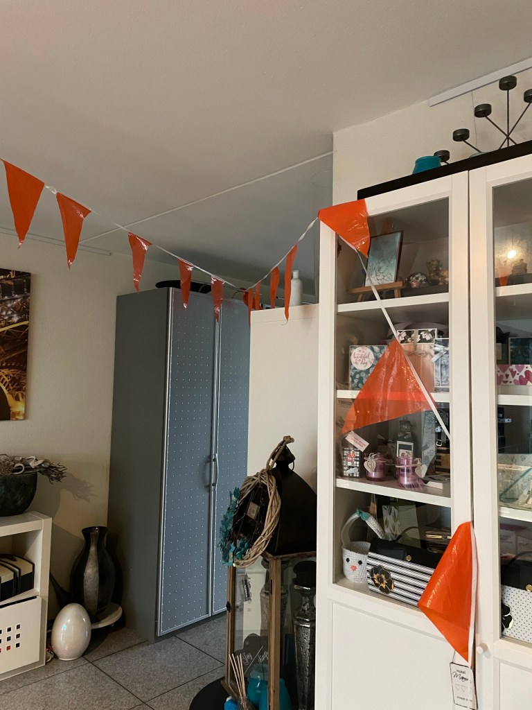 Hij was er erg blij mee. Vandaag zijn verjaardag met een deel van het gezin gevierd. Dadelijk oranje kleren aan en voor de tv zitten. Kijken naar Dennis. De oranje slingers hangen voor beide zonen.