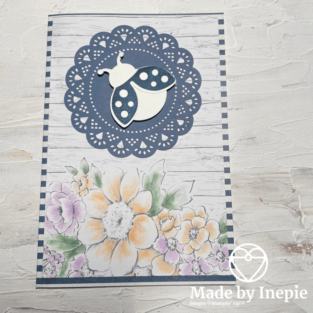 De gestreepte basis is dus kant en klaar. Daarboven op heb ik een kaart uit de cardpack geplakt. Daarop een Heart & Home Doilie en daarboven op een lieveheersbeestje uit de Geluksbrengertjes bundel ( Hello Ladybug Bundle bldz 20) .